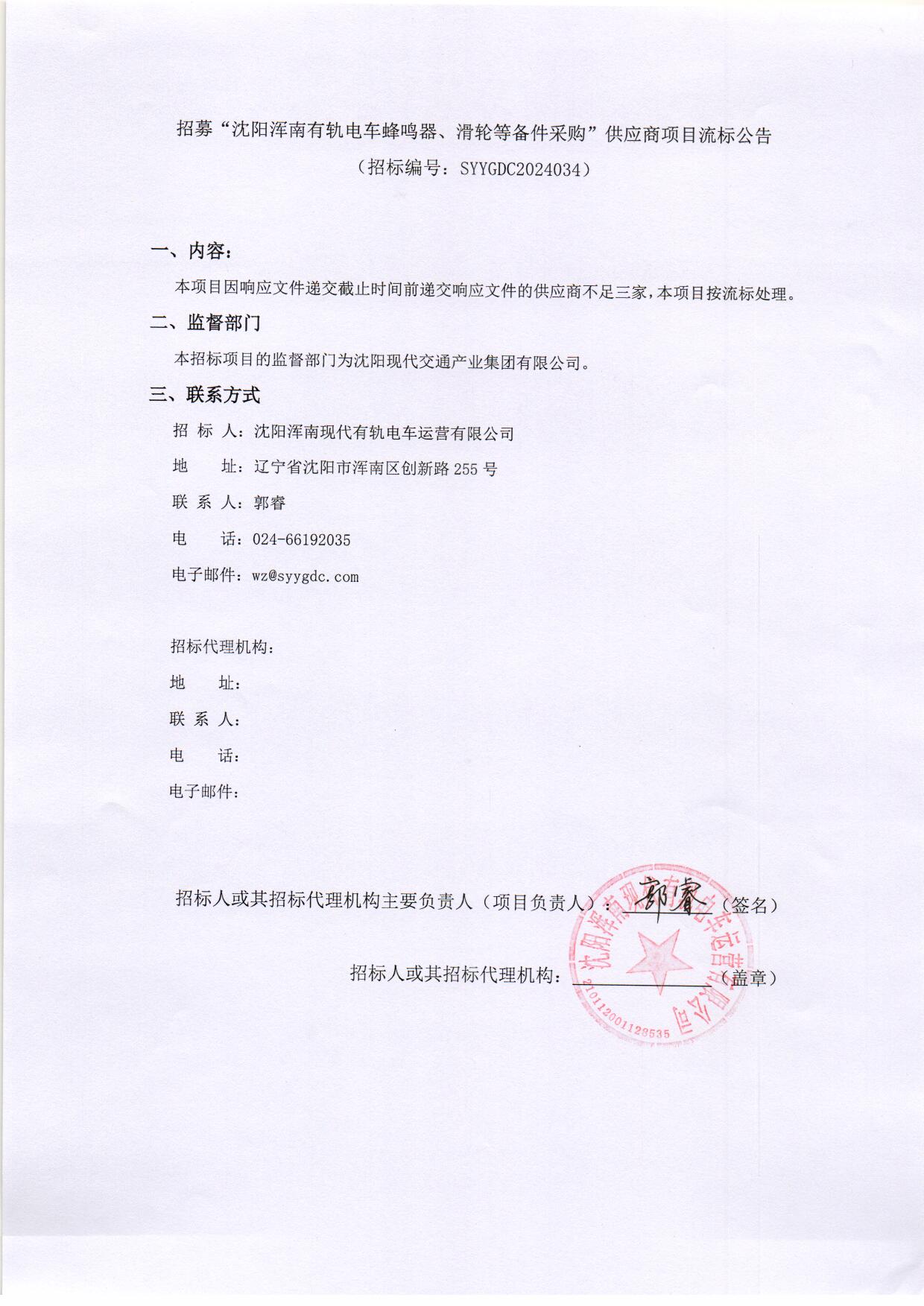 招募“沈阳浑南有轨电车蜂鸣器、滑轮等备件采购”供应商项目流标公告