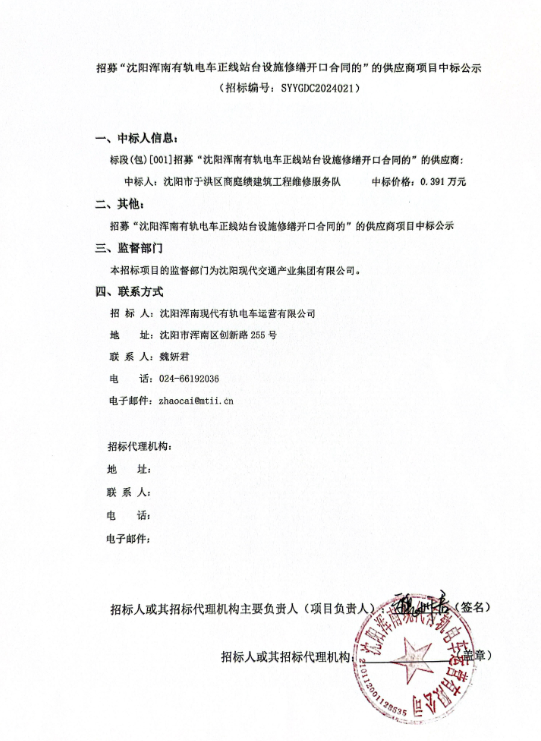 招募“沈阳浑南有轨电车正线站台设施修缮开口合同的”的供应商项目中标公示