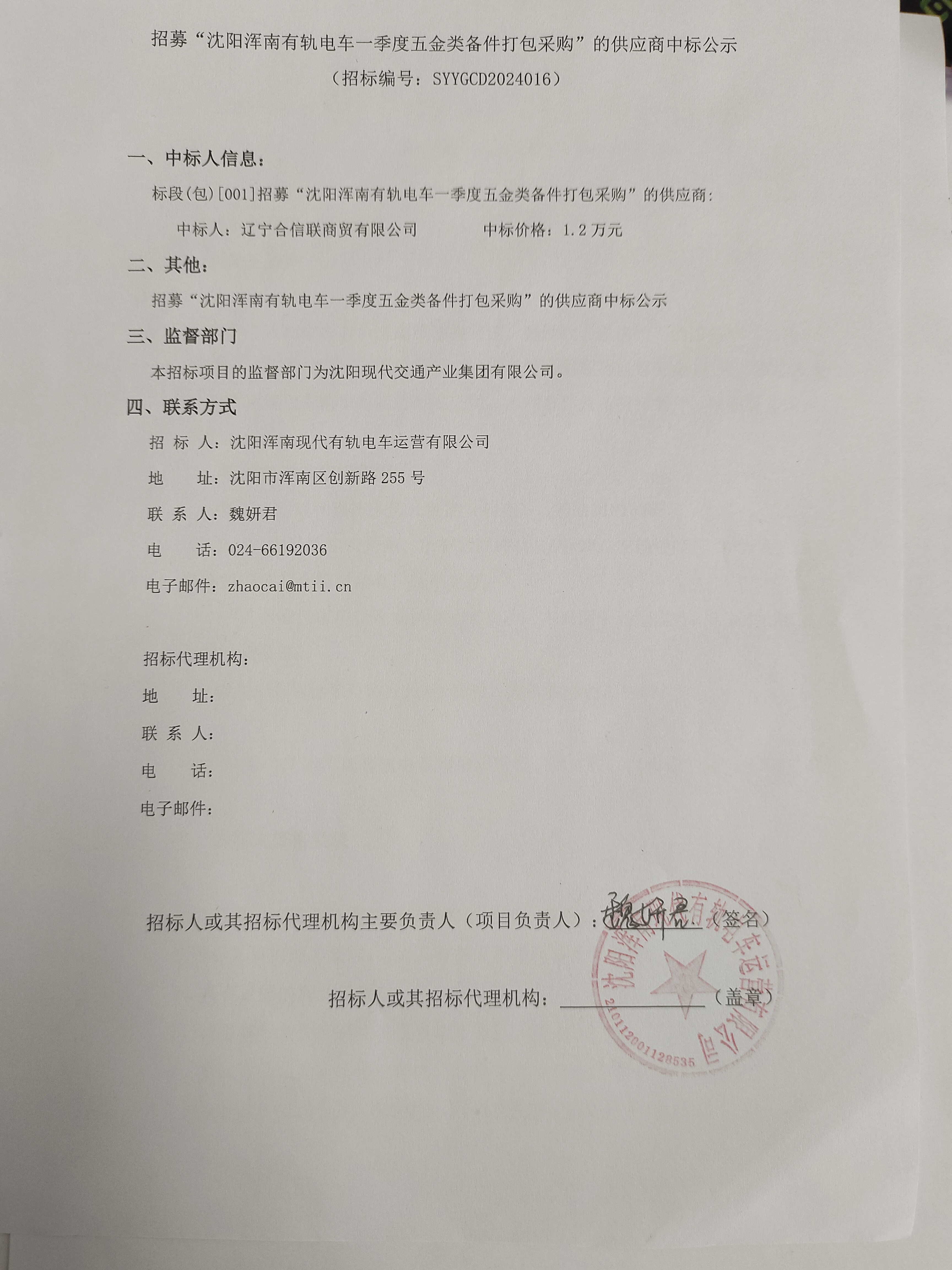 招募“沈阳浑南有轨电车一季度五金类备件打包采购”的供应商中标公示