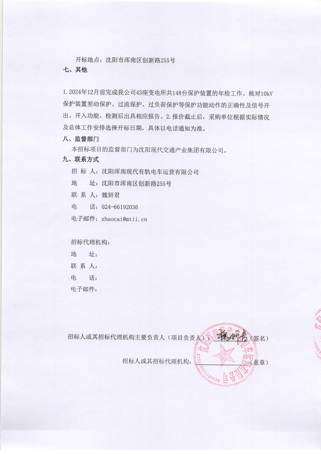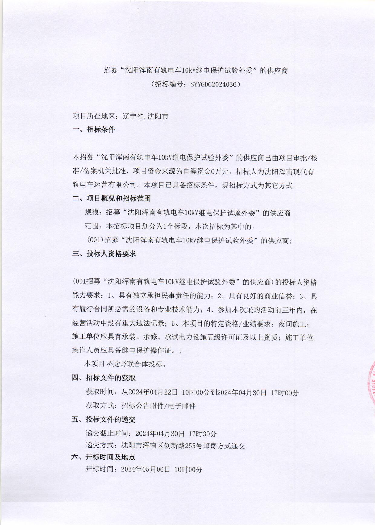 招募“沈阳浑南有轨电车10kV继电保护试验外委”的供应商-递交文件模版及相关说明