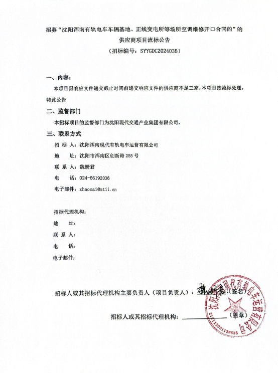 招募“沈阳浑南有轨电车车辆基地、正线变电所等场所空调维修开口合同的”的供应商项目流标公告