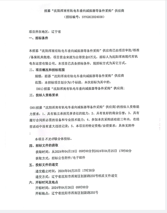 招募“沈阳浑南有轨电车垂向减振器备件采购”供应商