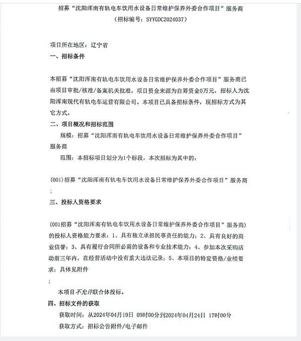 招募“沈阳浑南有轨电车饮用水设备日常维护保养外委合作项目”服务商