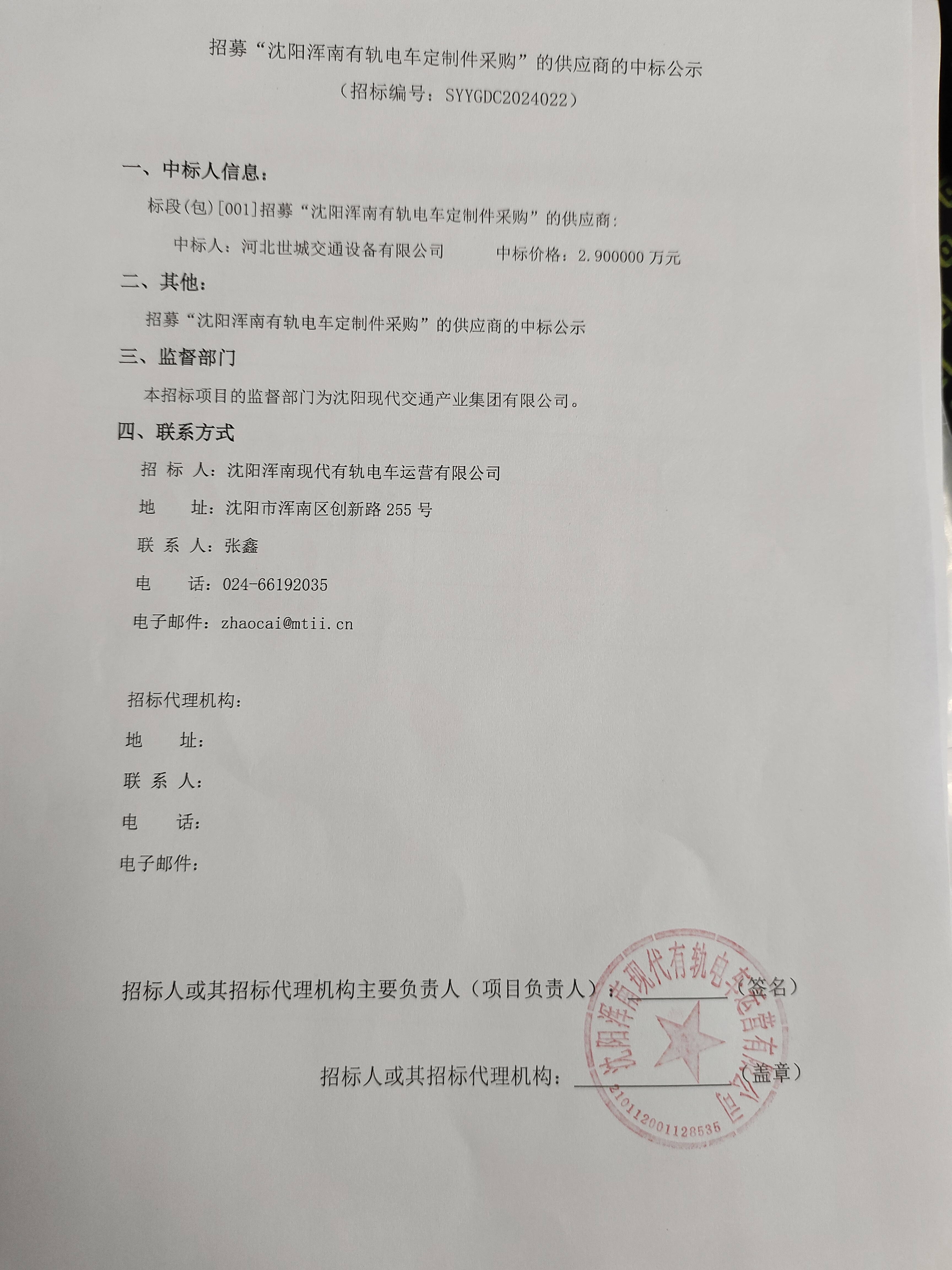 招募“沈阳浑南有轨电车定制件采购”的供应商的中标公示