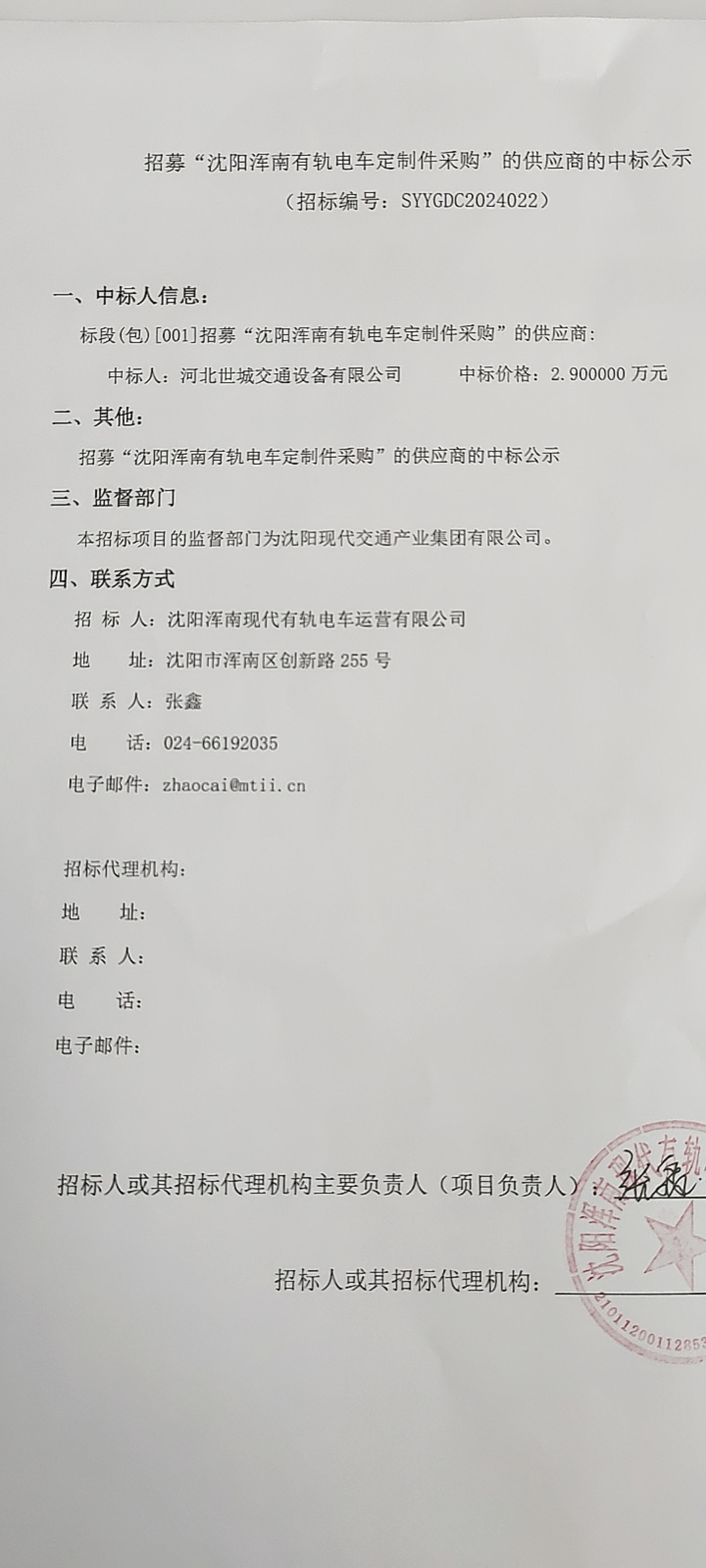 招募“沈阳浑南有轨电车定制件采购”的供应商的中标公示