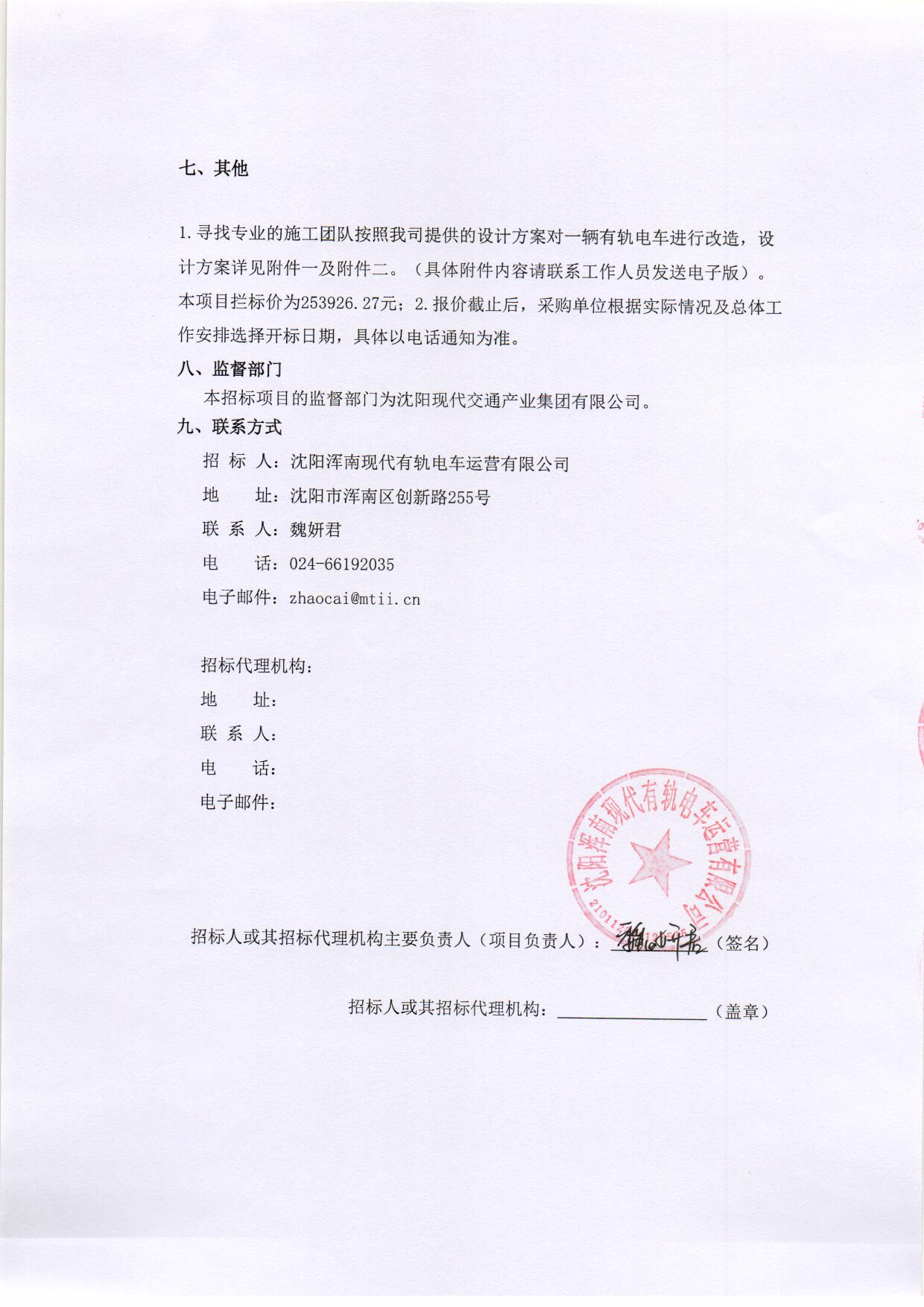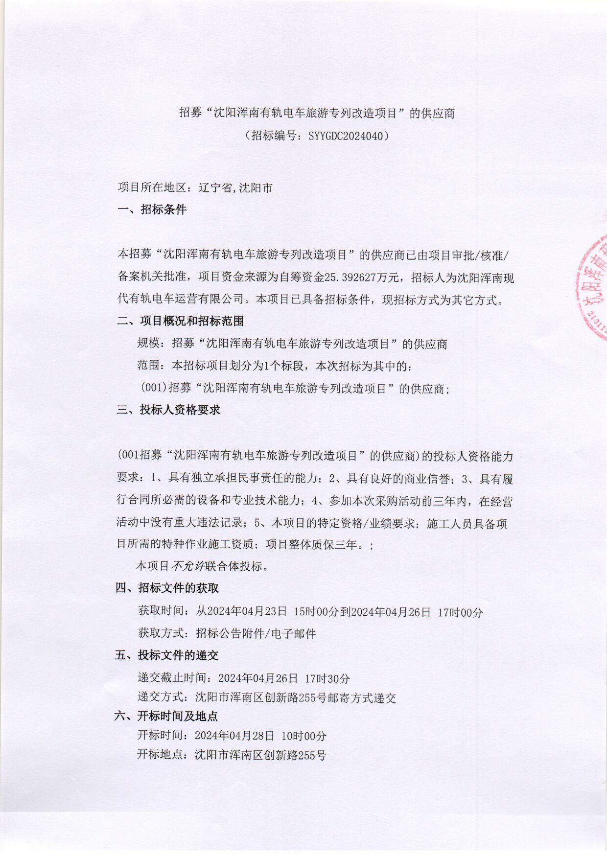 招募“沈阳浑南有轨电车旅游专列改造项目”的供应商