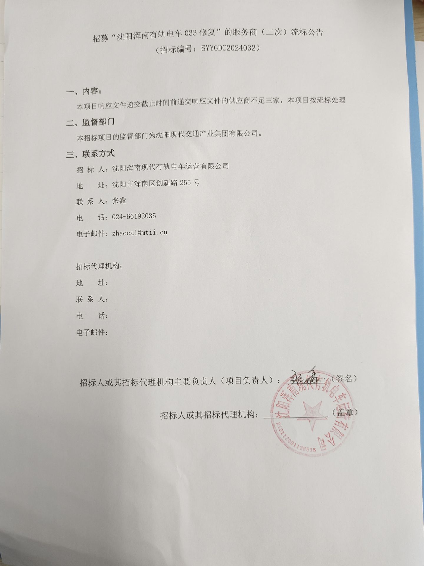 招募“沈阳浑南有轨电车033修复”的服务商(二次)流标公告