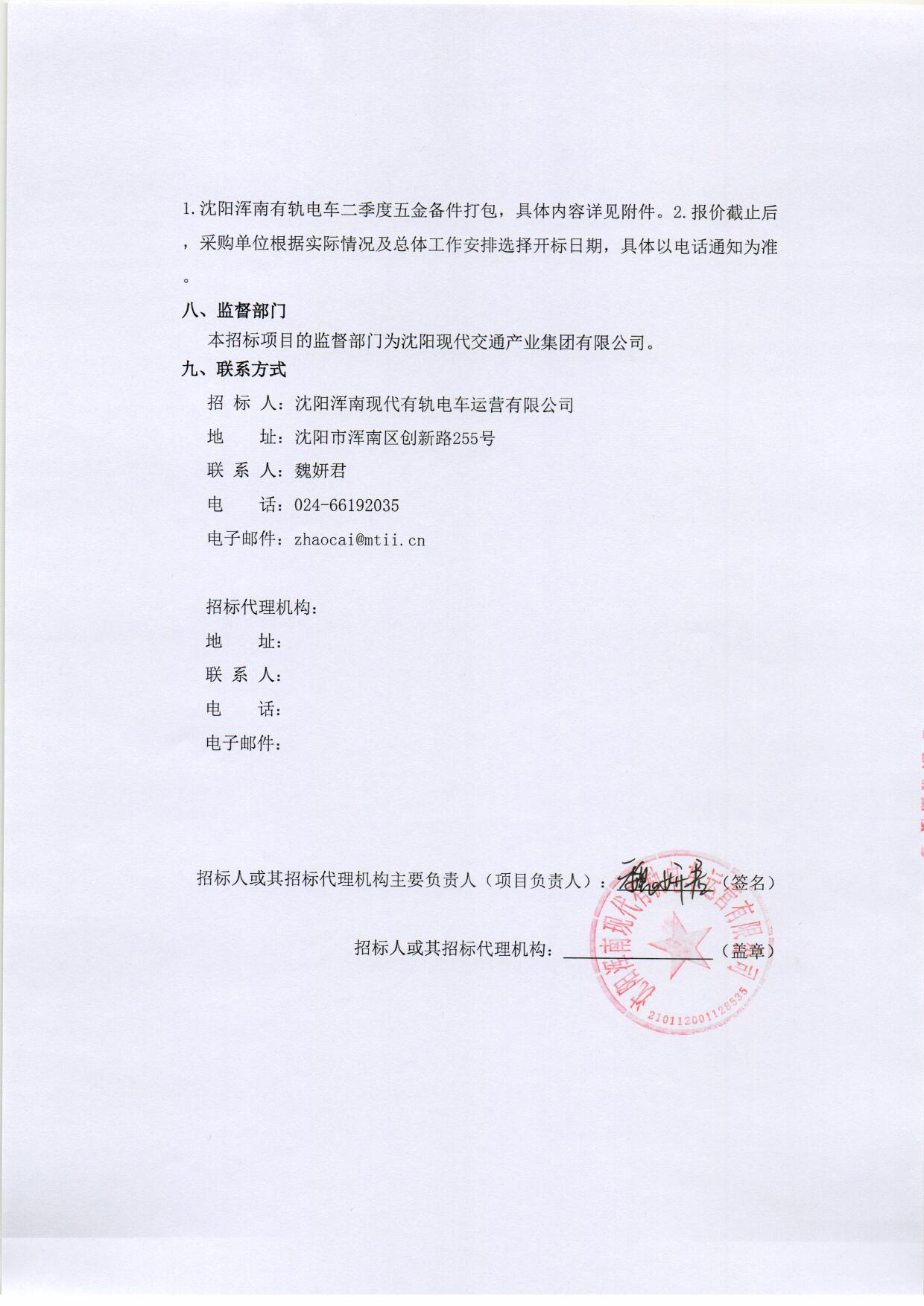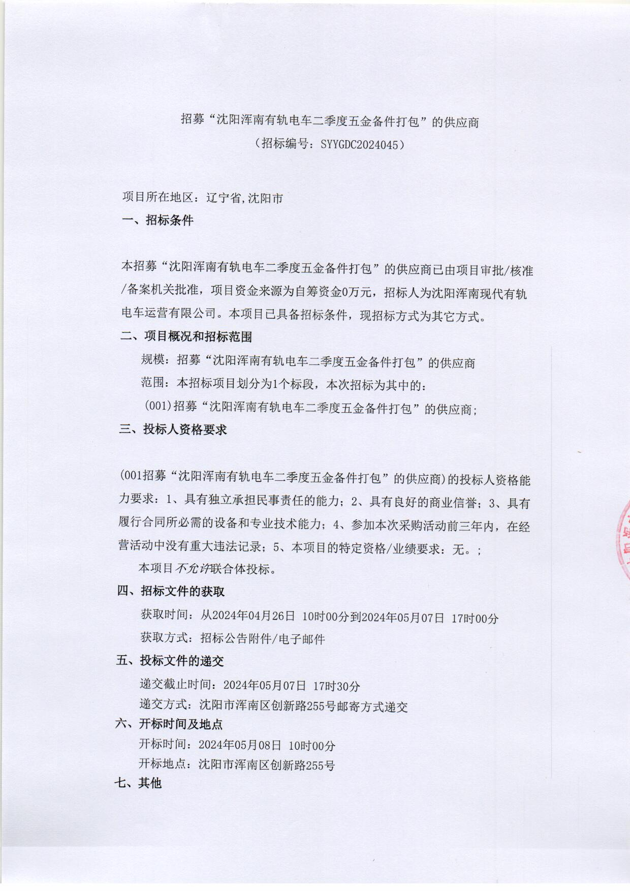 招募“沈阳浑南有轨电车二季度五金备件打包”的供应商