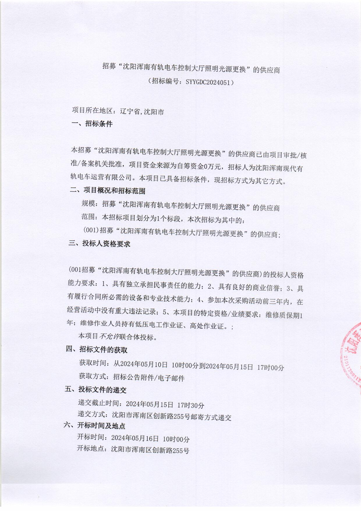 招采公告-招募“沈阳浑南有轨电车控制大厅照明光源更换”的供应商