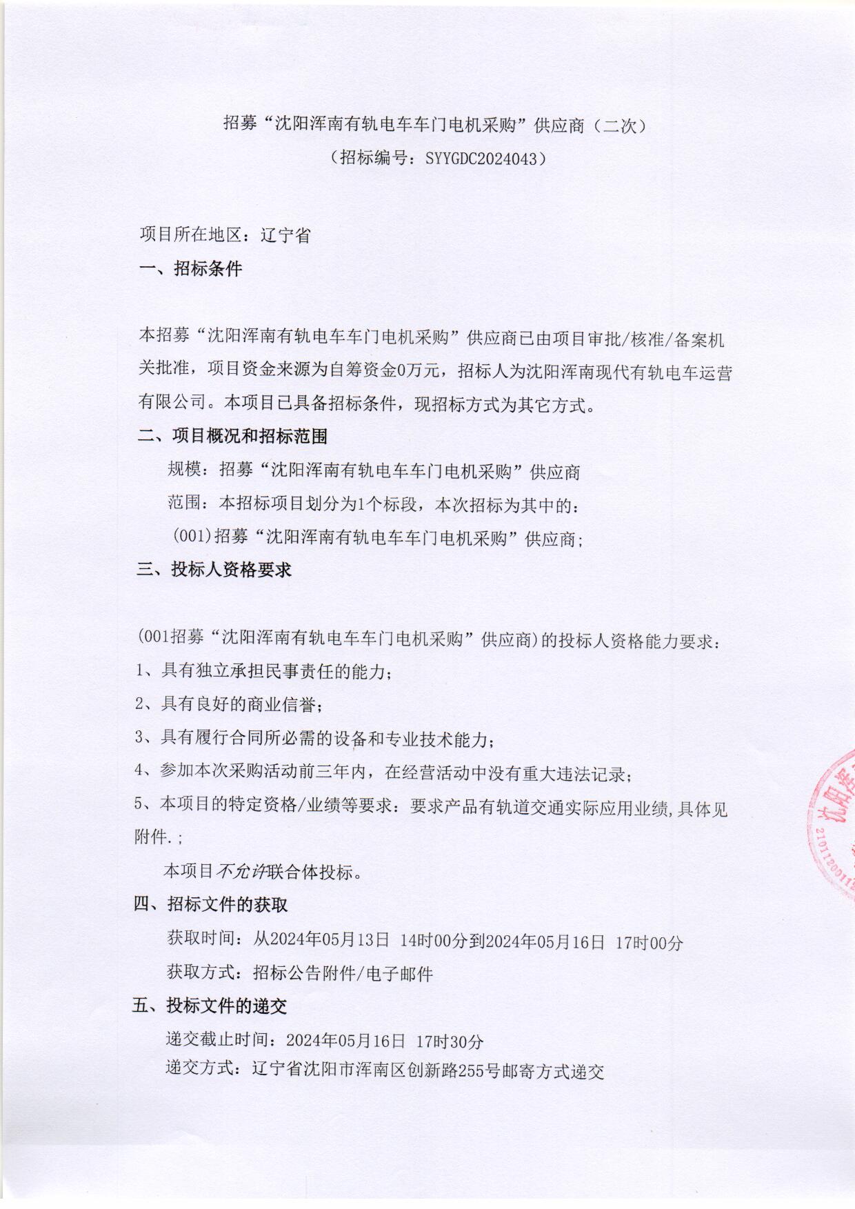 招采公告-招募“沈阳浑南有轨电车车门电机采购”供应商(二次)