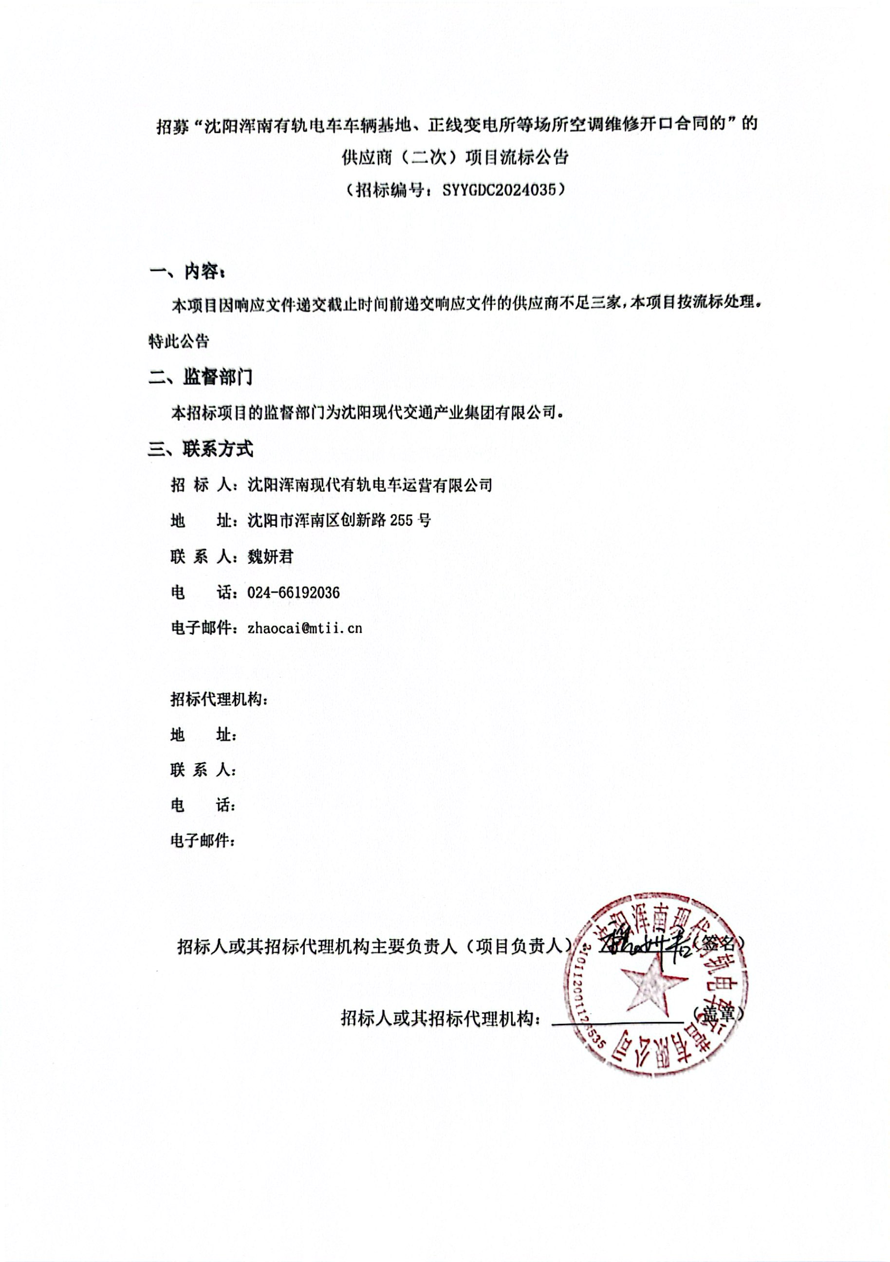 招募“沈阳浑南有轨电车车辆基地、正线变电所等场所空调维修开口合同的”的供应商(二次)项目流标公告