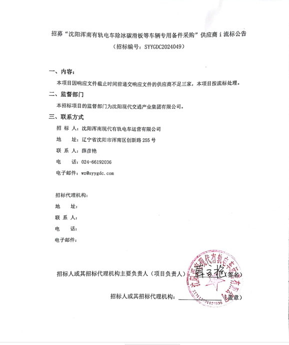 招募“沈阳浑南有轨电车除冰碳滑板等车辆专用备件采购”供应商流标公告