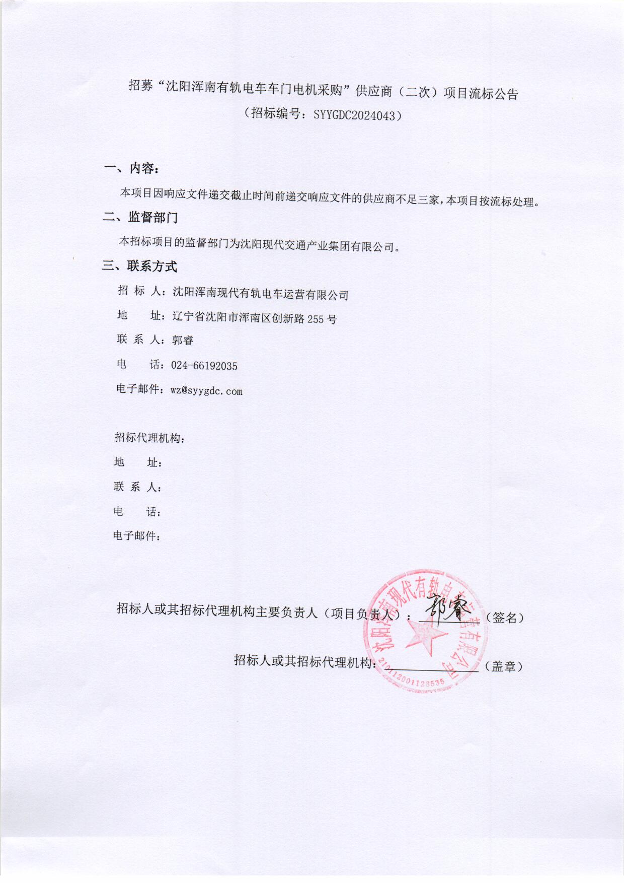 招募“沈阳浑南有轨电车车门电机采购”供应商(二次)项目流标公告