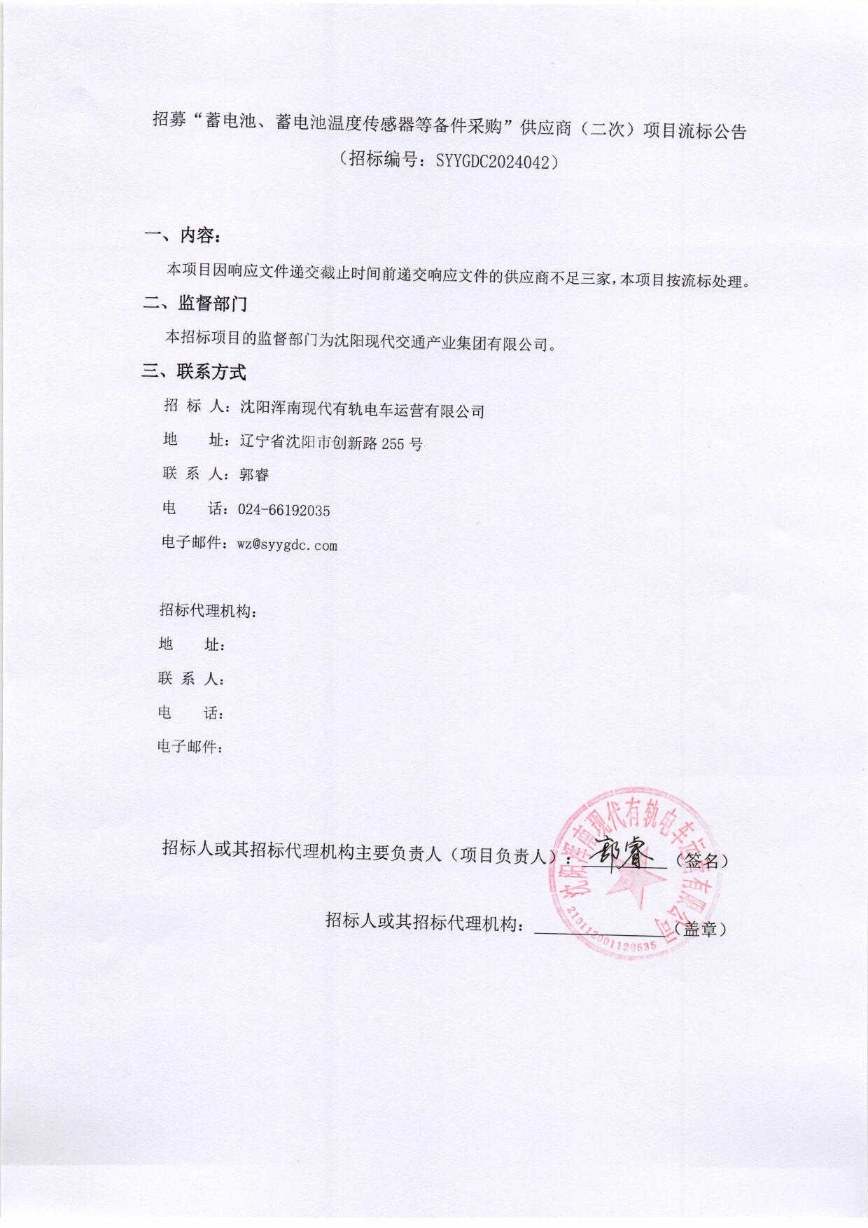 招募“蓄电池、蓄电池温度传感器等备件采购”供应商(二次)项目流标公告