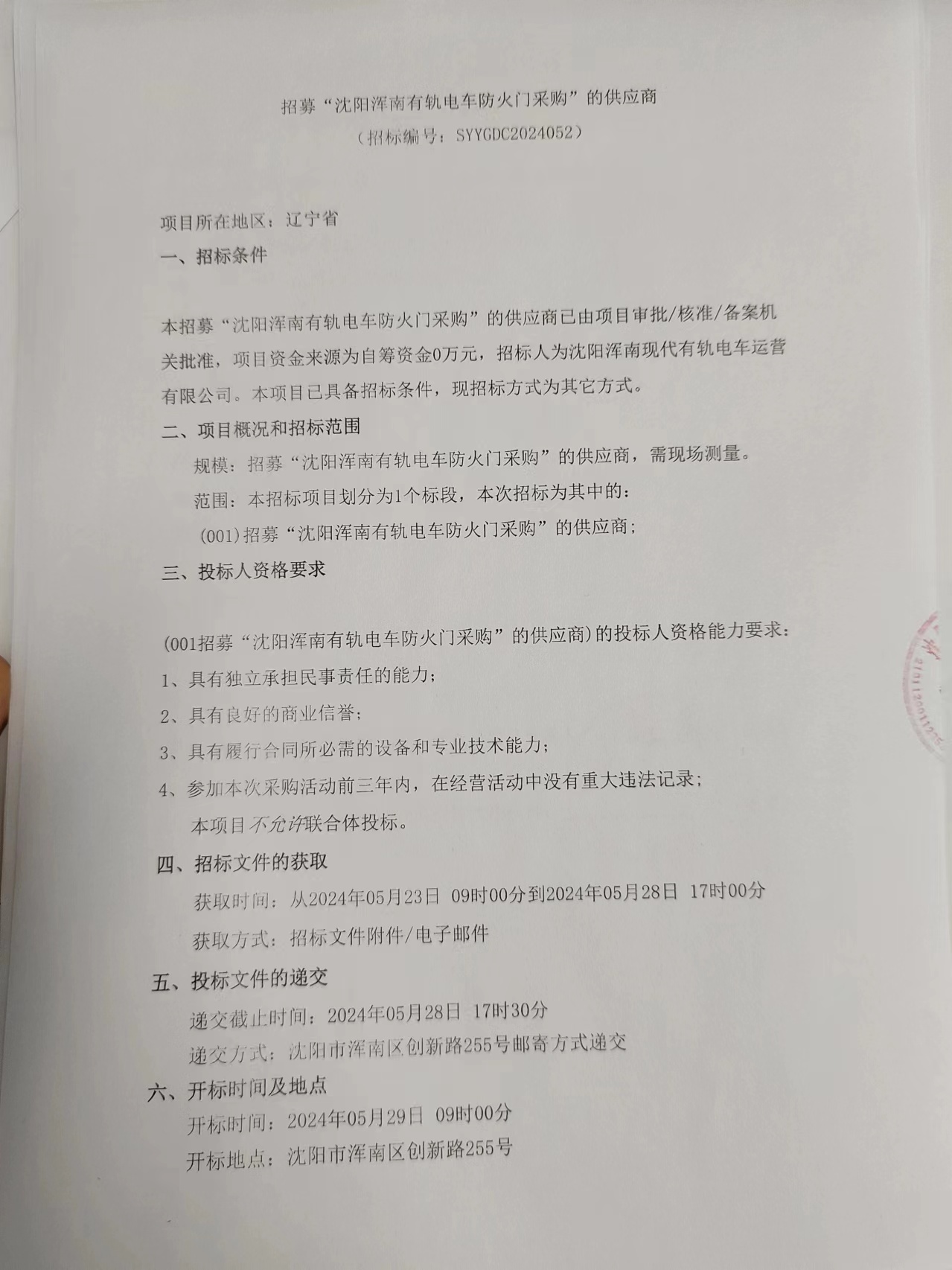 招采公告-招募“沈阳浑南有轨电车防火门采购”的供应商