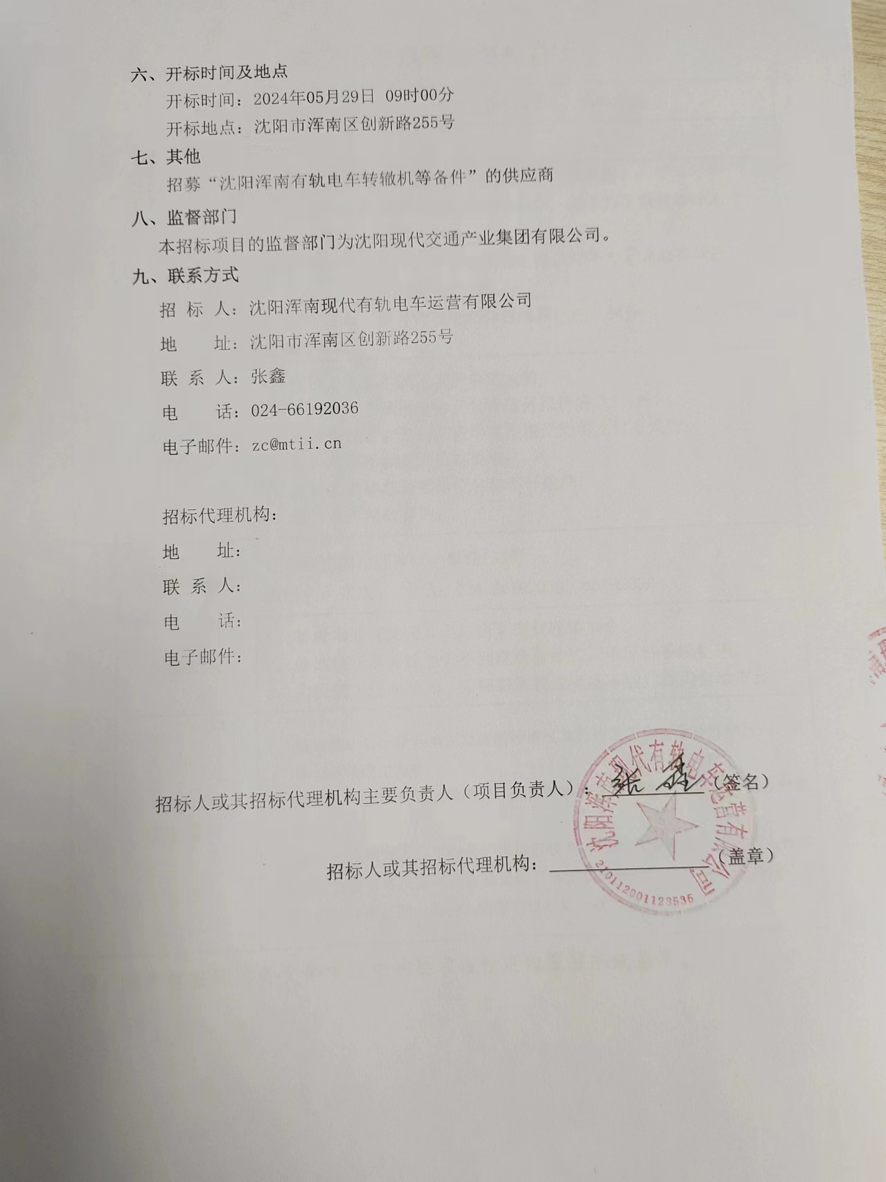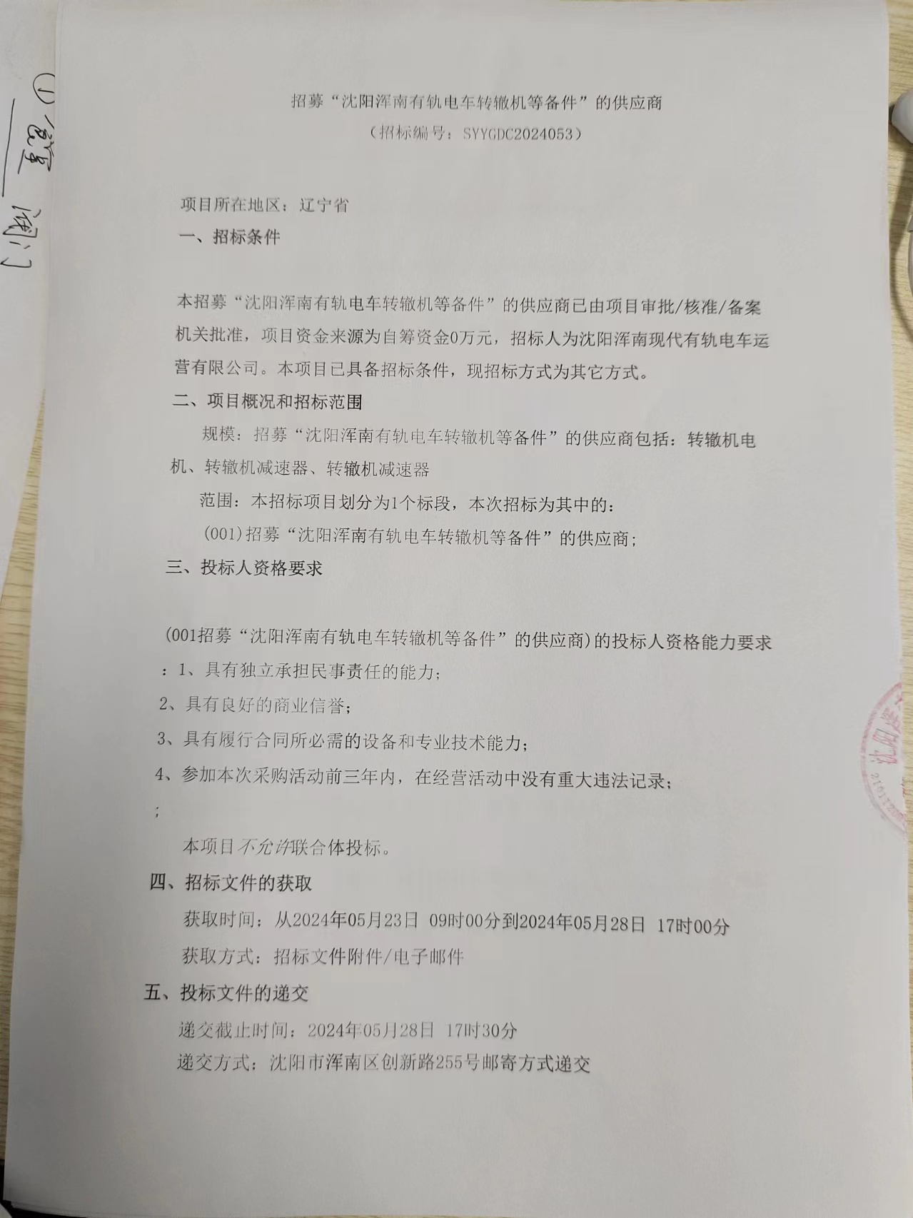 招采公告-招募“沈阳浑南有轨电车转辙机等备件”的供应商