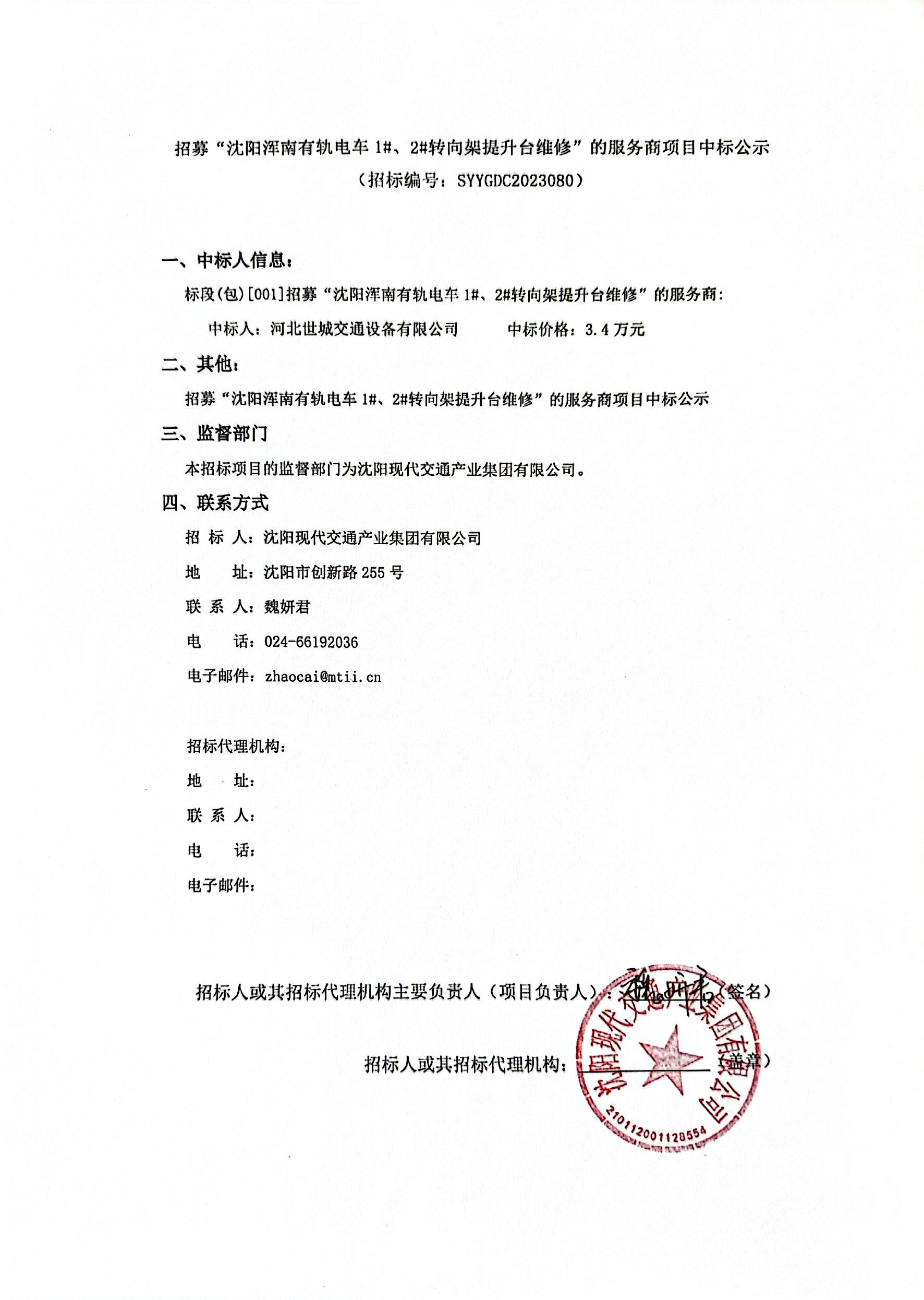 招募“沈阳浑南有轨电车1#、2#转向架提升台维修”的服务商项目中标公示