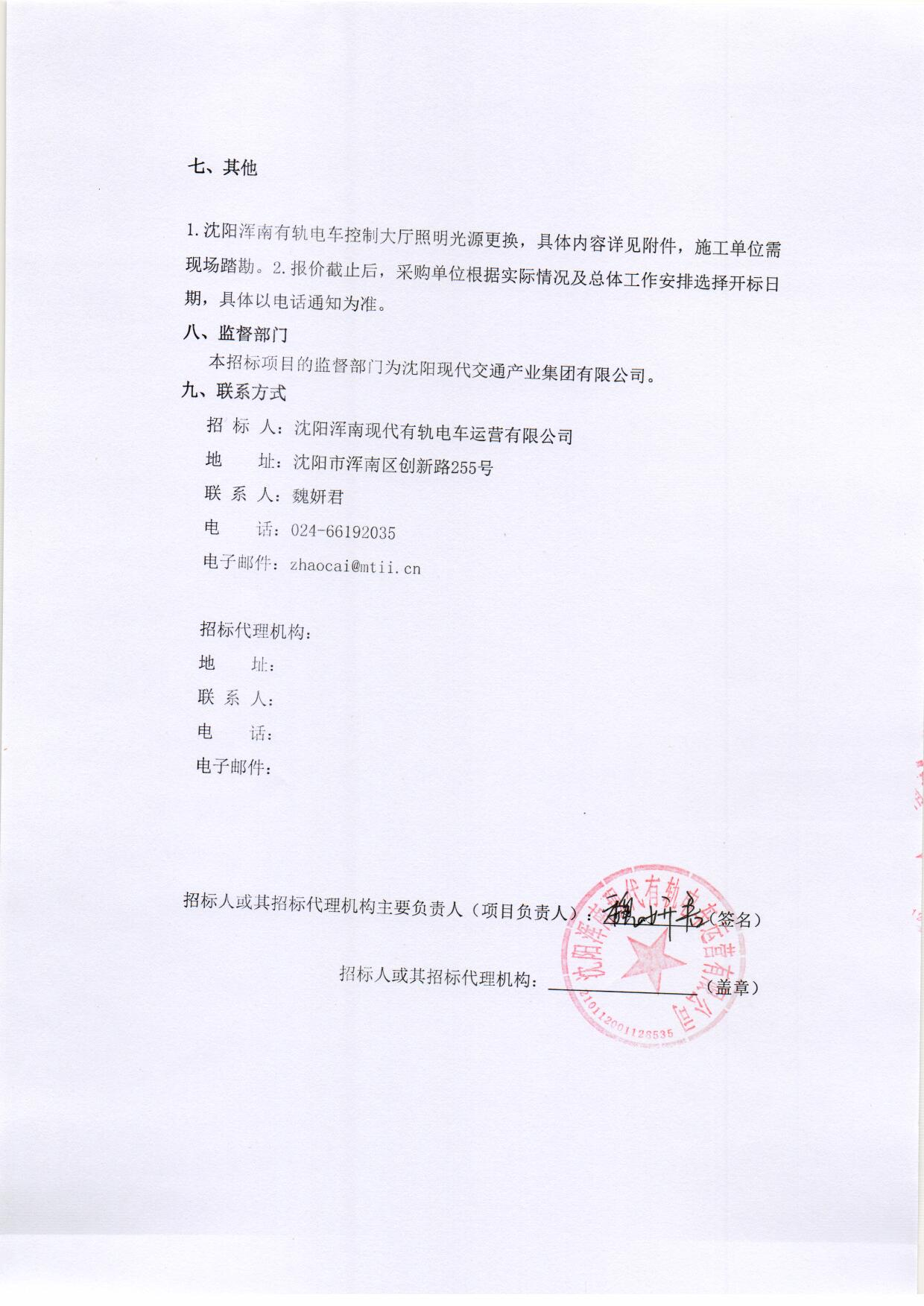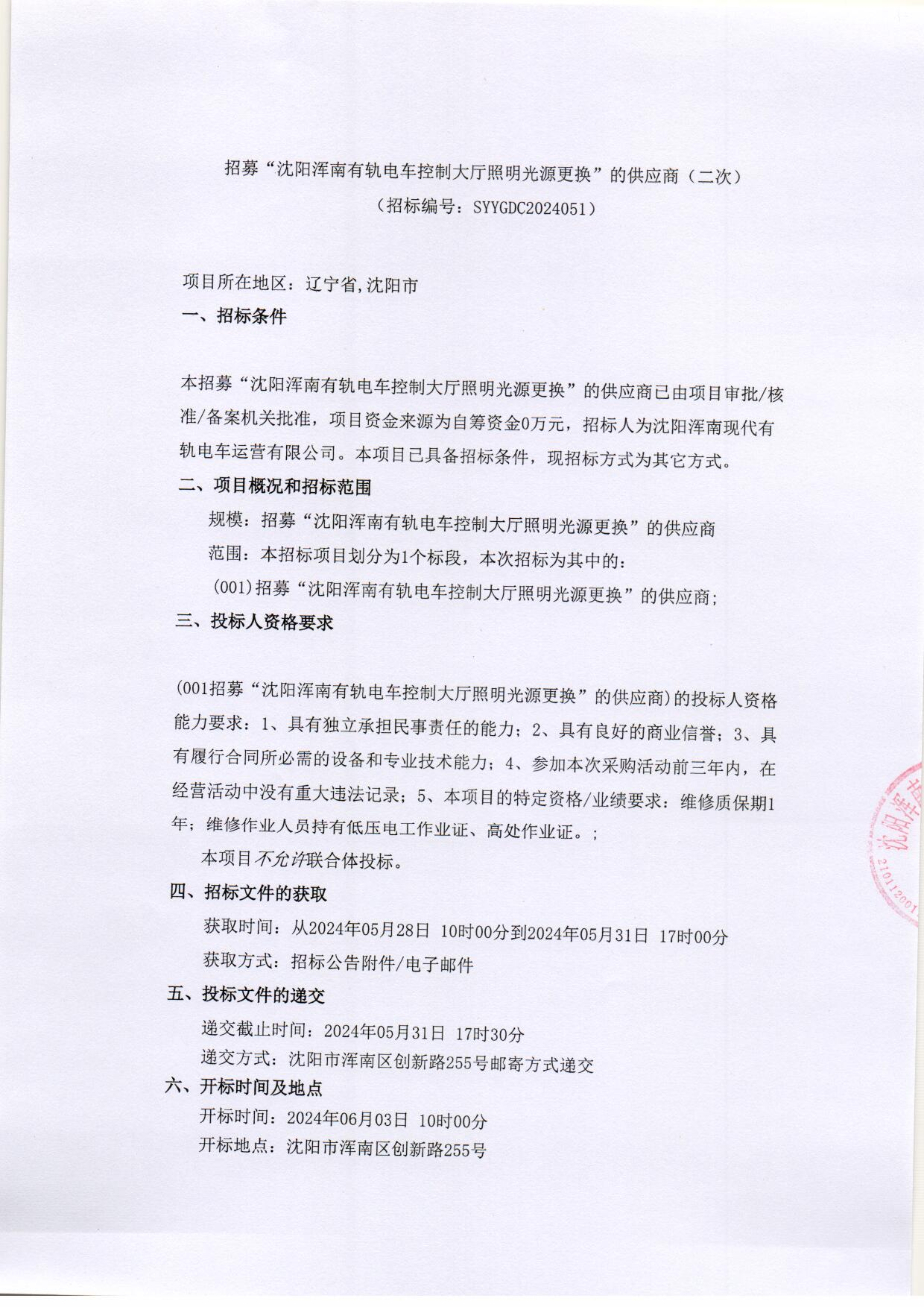 招采公告-招募“沈阳浑南有轨电车控制大厅照明光源更换”的供应商(二次)