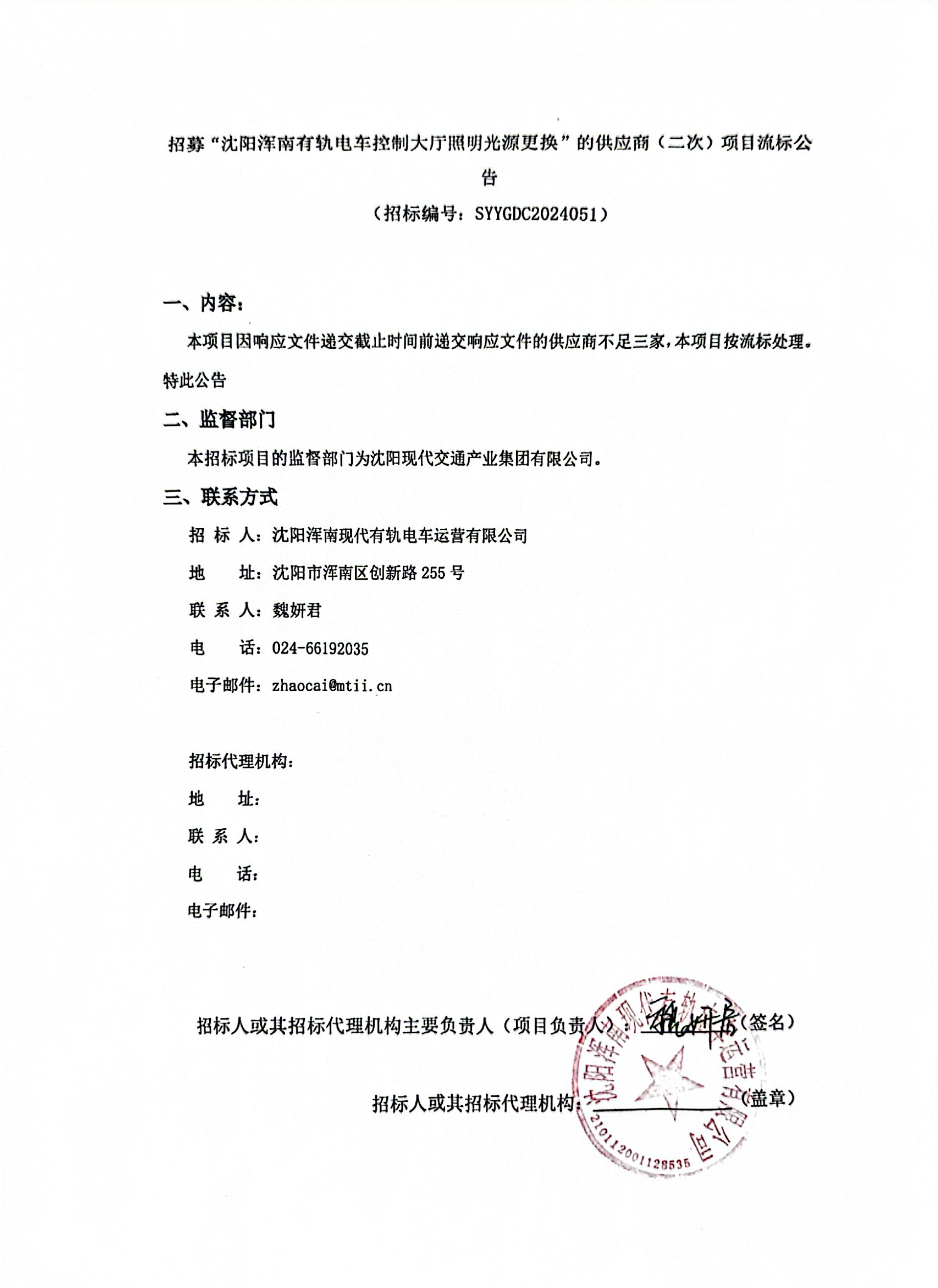 招募“沈阳浑南有轨电车控制大厅照明光源更换”的供应商(二次)项目流标公告