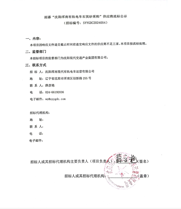 招募“沈阳浑南有轨电车石英砂采购”供应商流标公示