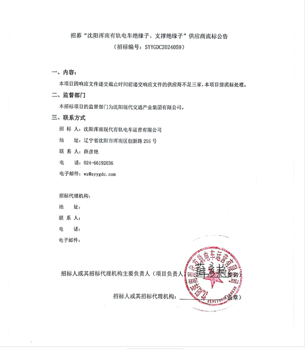 招募“沈阳浑南有轨电车绝缘子、支撑绝缘子”供应商流标公告