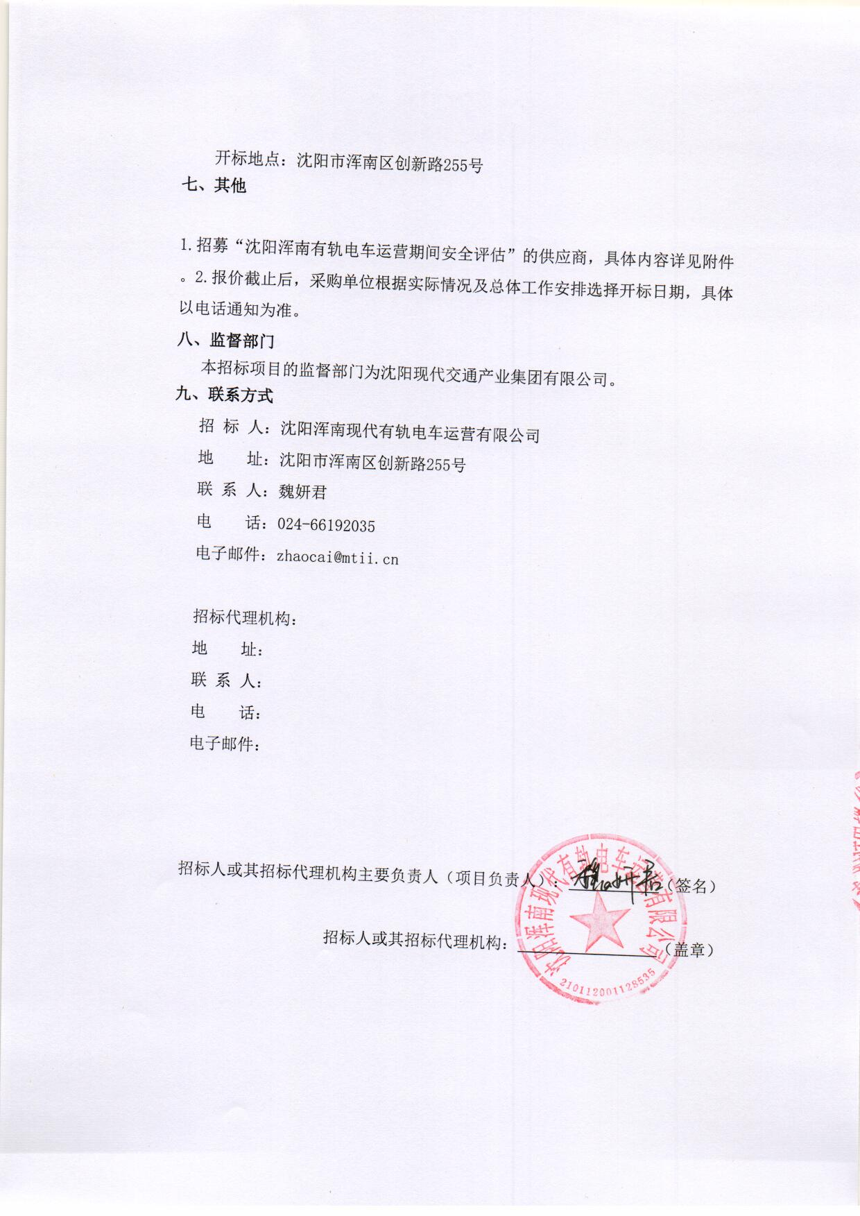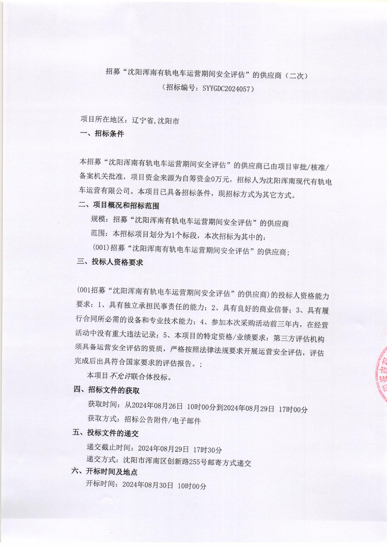 招采公告-招募“沈阳浑南有轨电车运营期间安全评估”的供应商(二次)