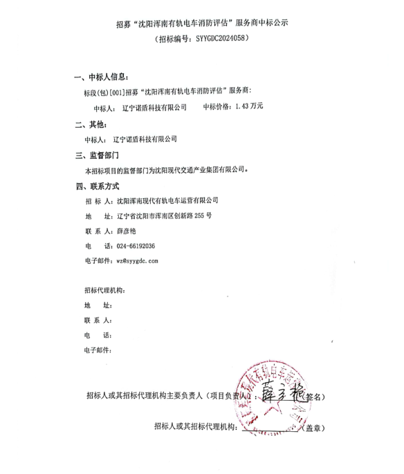 招募“沈阳浑南有轨电车消防评估”服务商中标公示