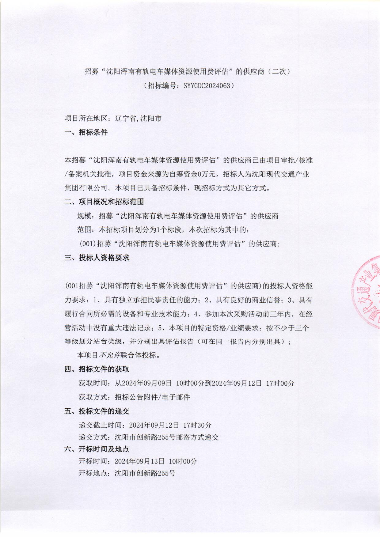 招采公告-招募“沈阳浑南有轨电车媒体资源使用费评估”的供应商(二次)