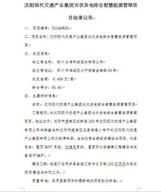 (沈阳现代交通产业集团光伏发电综合智慧能源管理项目)的中标公示