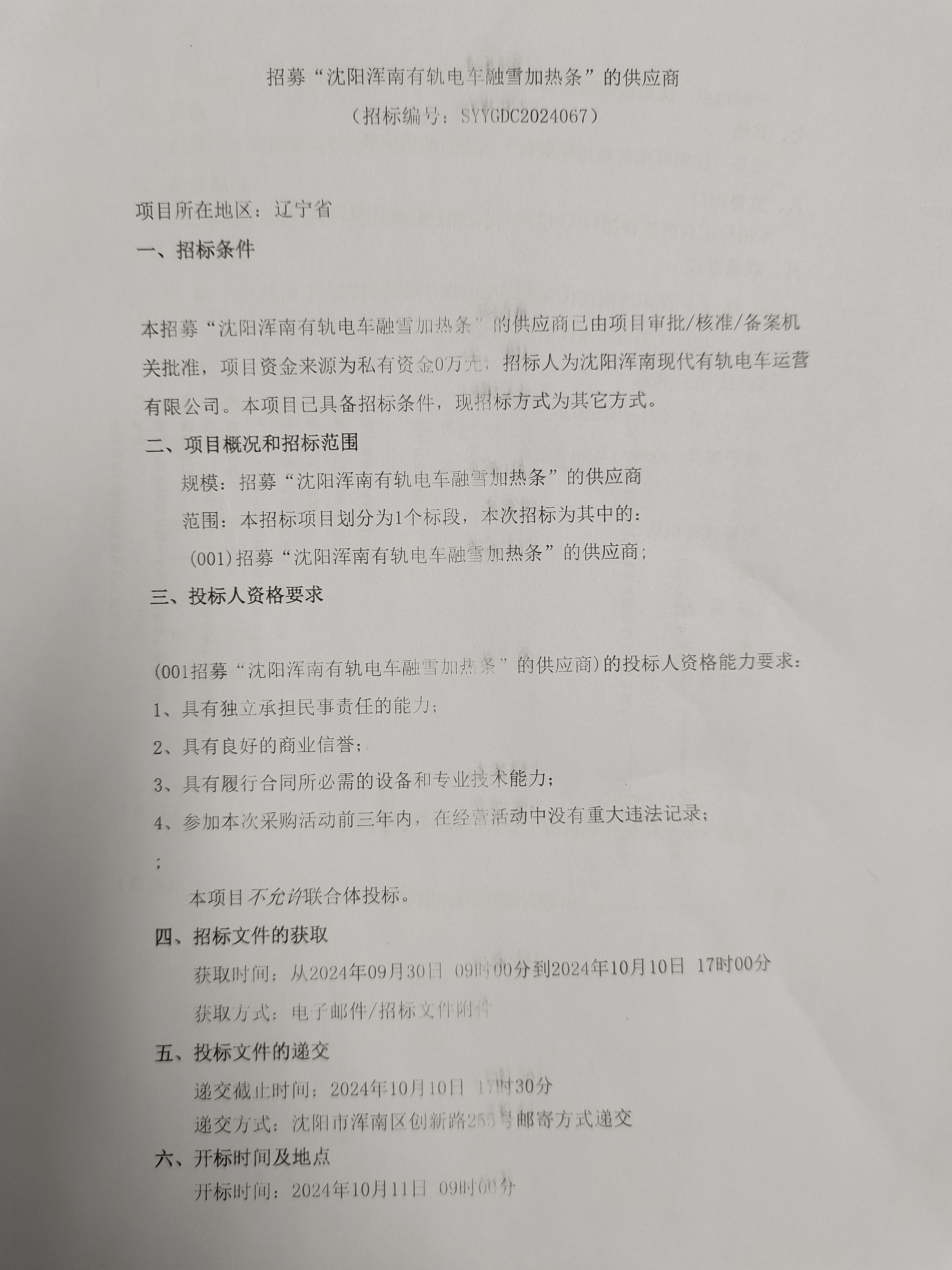 招采公告-招募“沈阳浑南有轨电车融雪加热条”的供应商