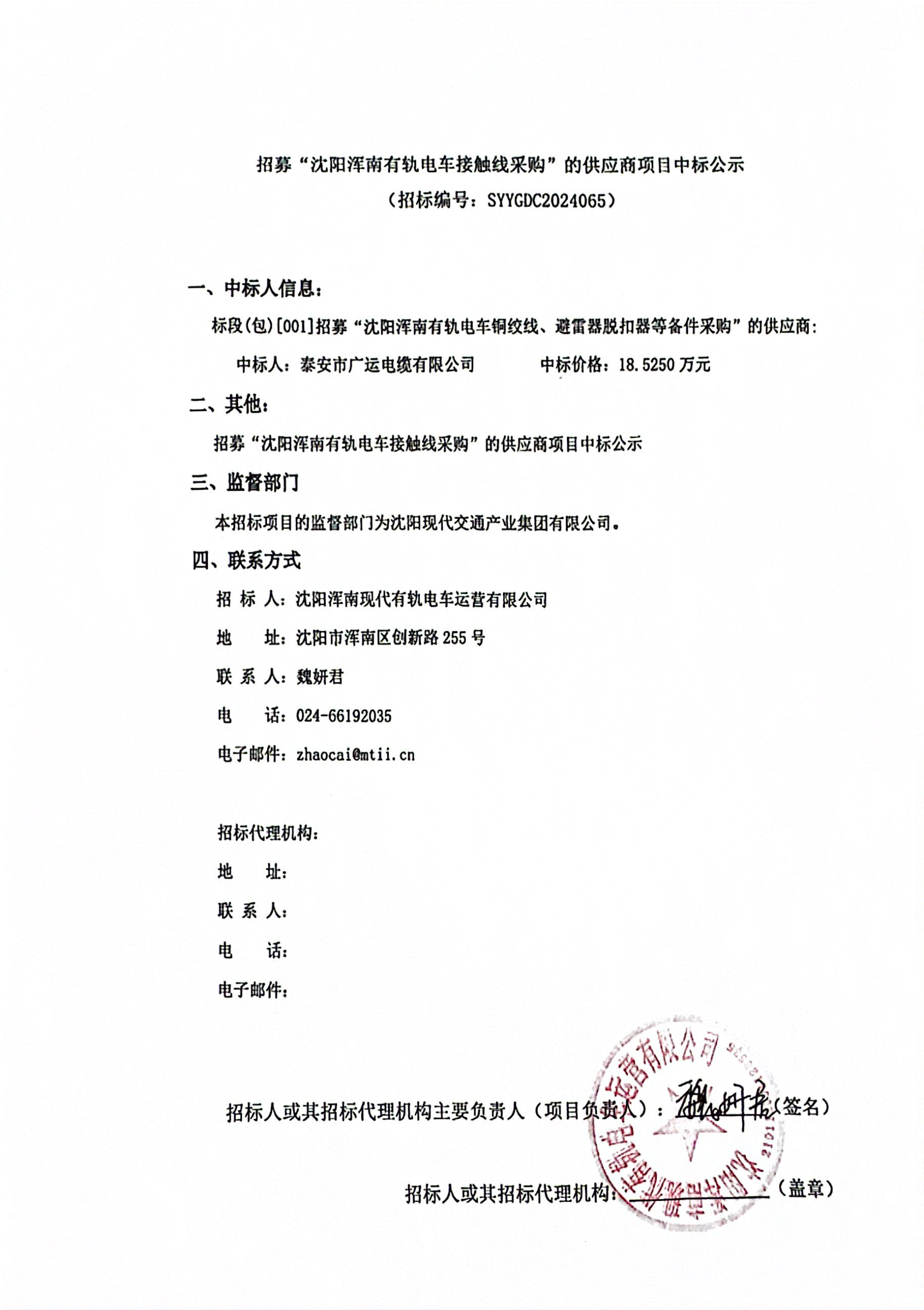 招募“沈阳浑南有轨电车接触线采购”的供应商项目中标公示