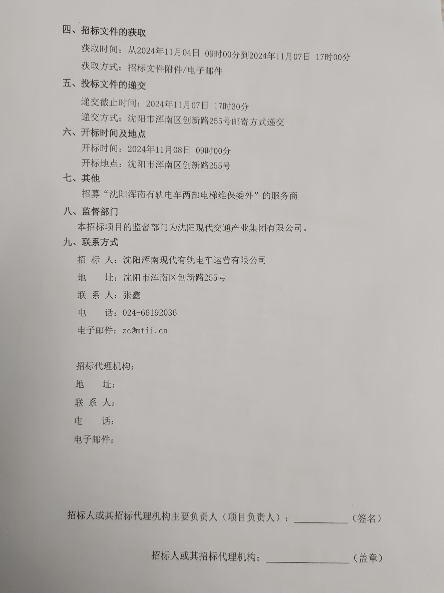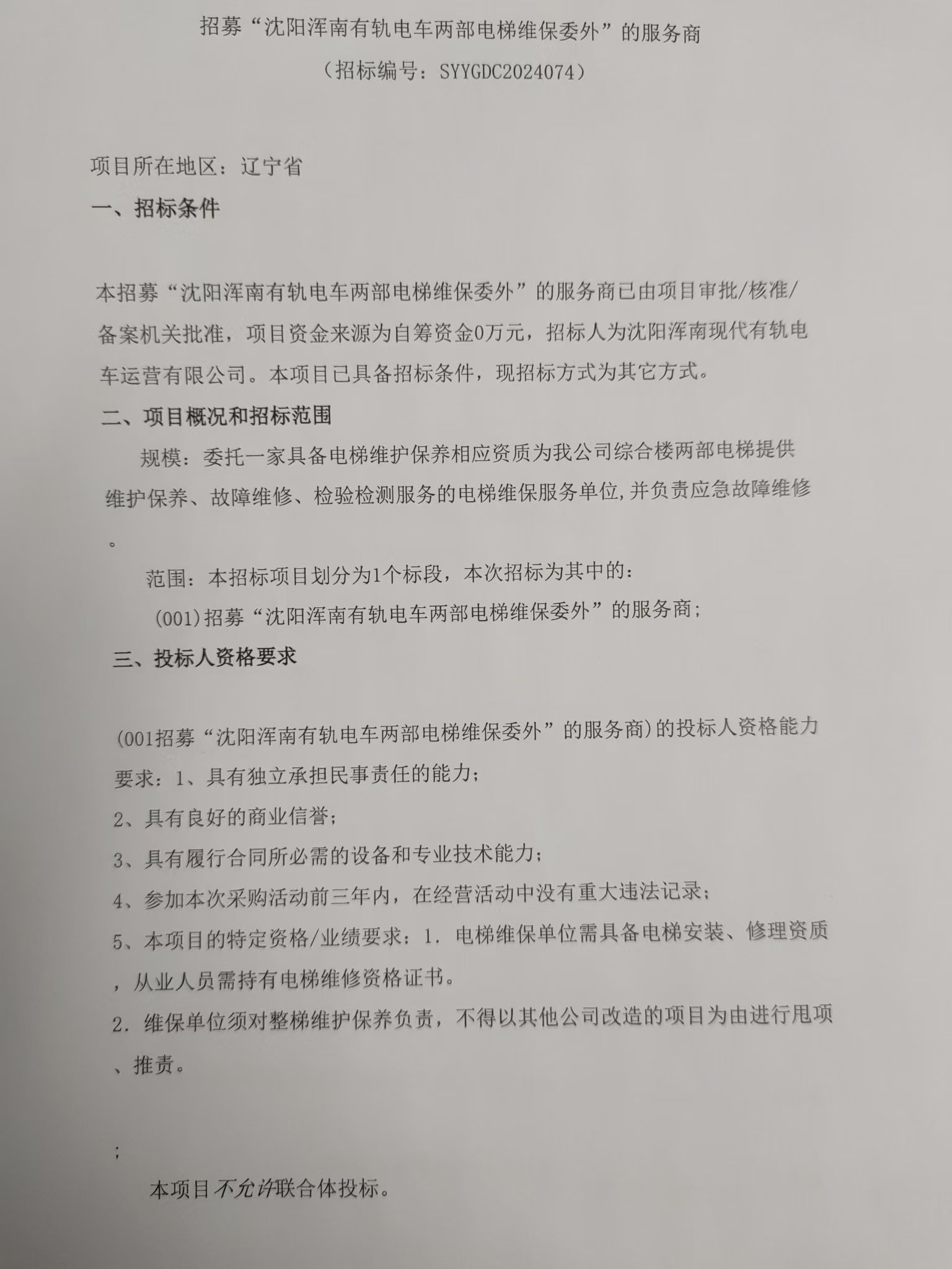 招采公告-招募“沈阳浑南有轨电车两部电梯维保委外”的服务商