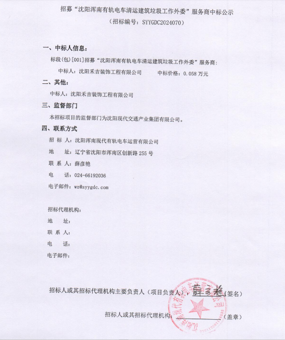 招募“沈阳浑南有轨电车清运建筑垃圾工作外委”服务商中标公示