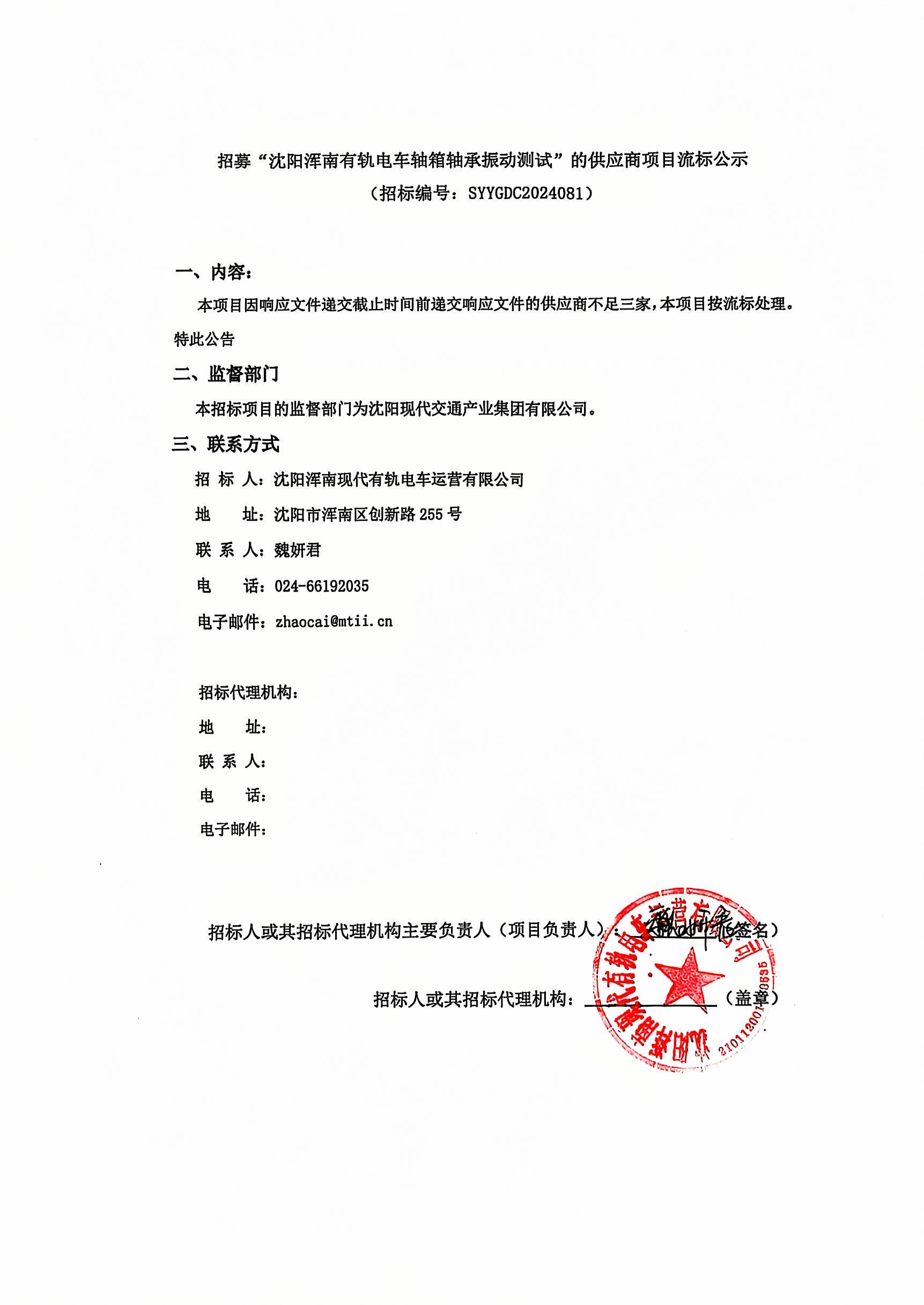 招募“沈阳浑南有轨电车轴箱轴承振动测试”的供应商项目流标公示