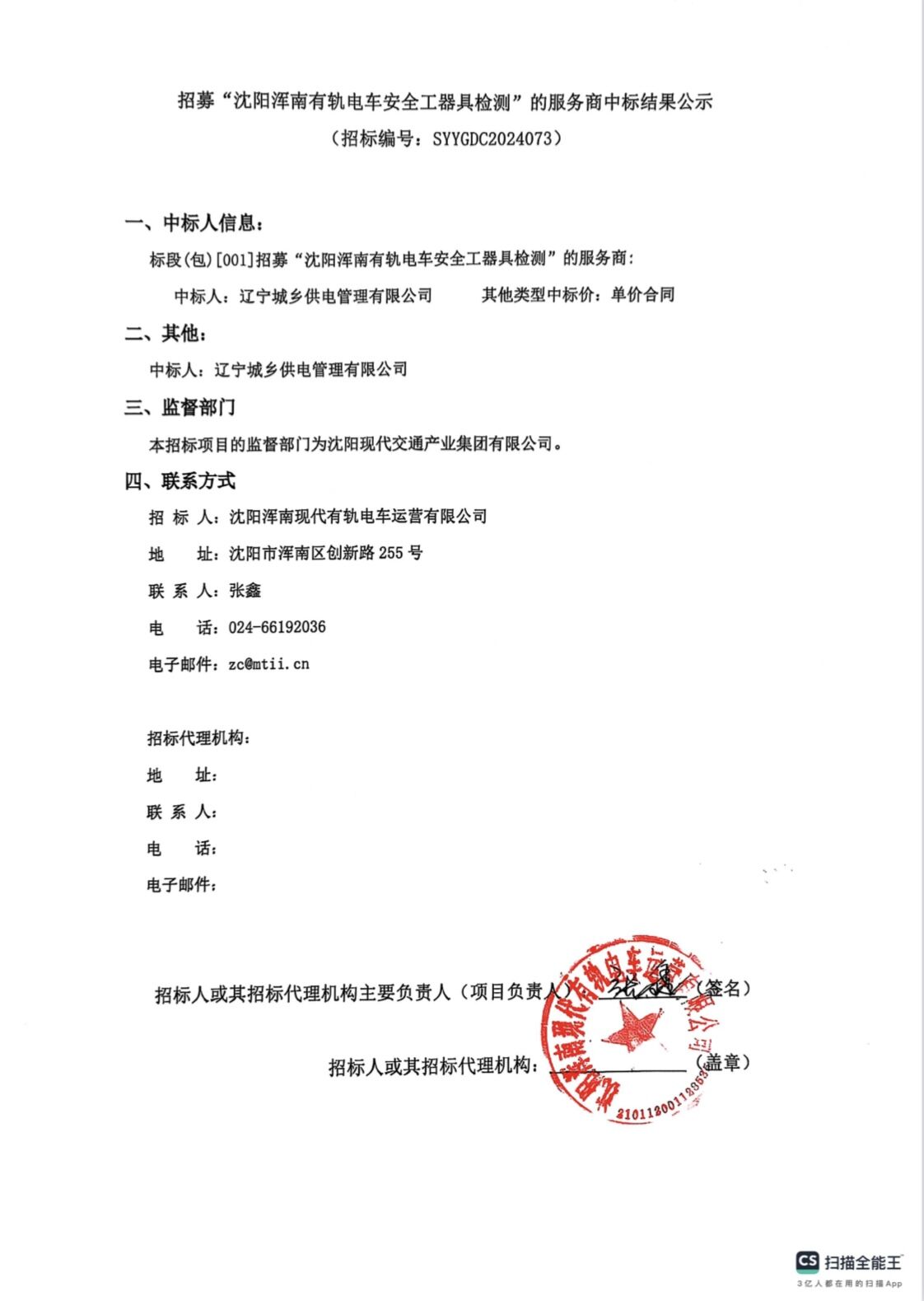 招募“沈阳浑南有轨电车安全工器具检测”的服务商中标结果公示