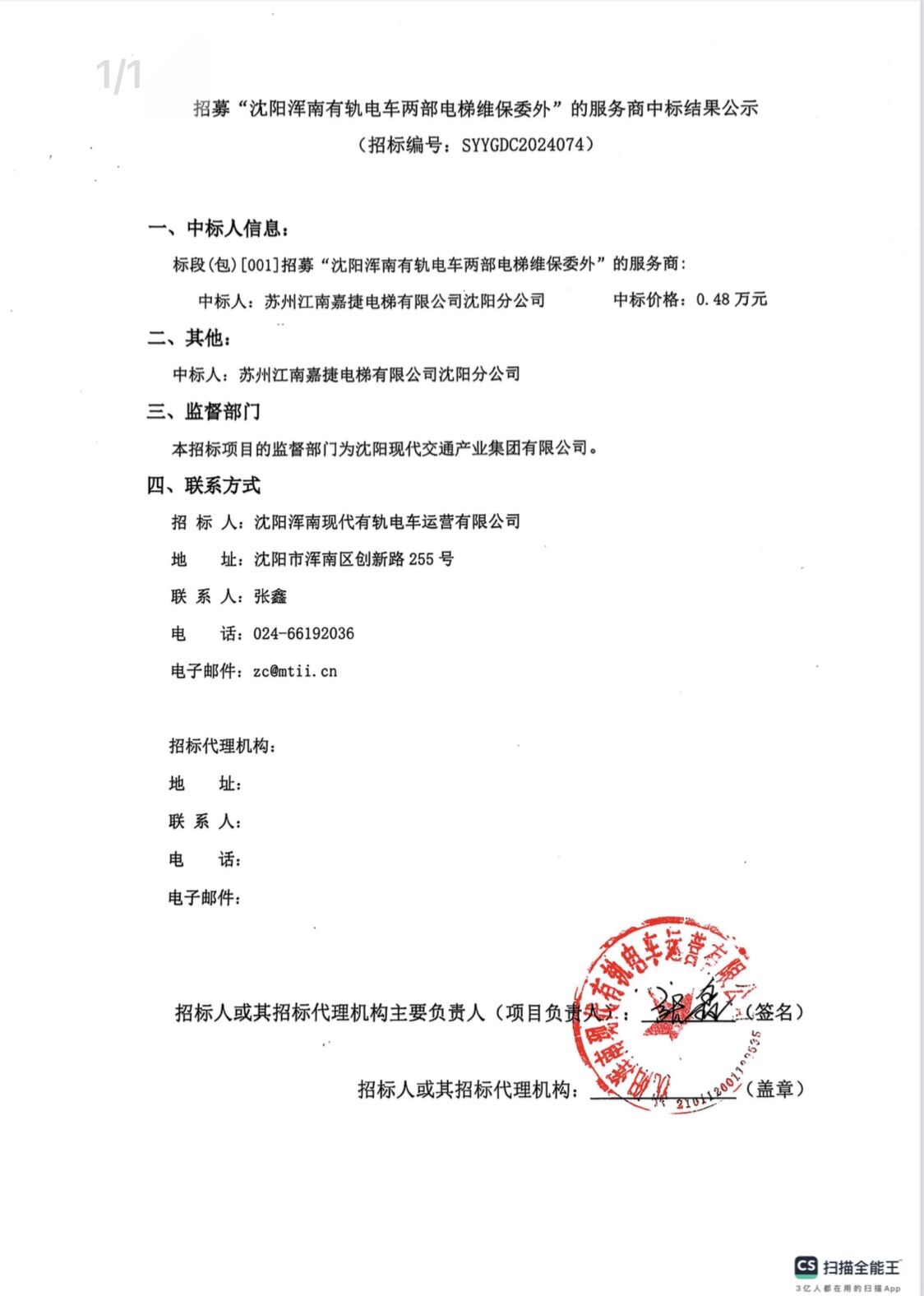 招募“沈阳浑南有轨电车两部电梯维保委外”的服务商中标结果公示