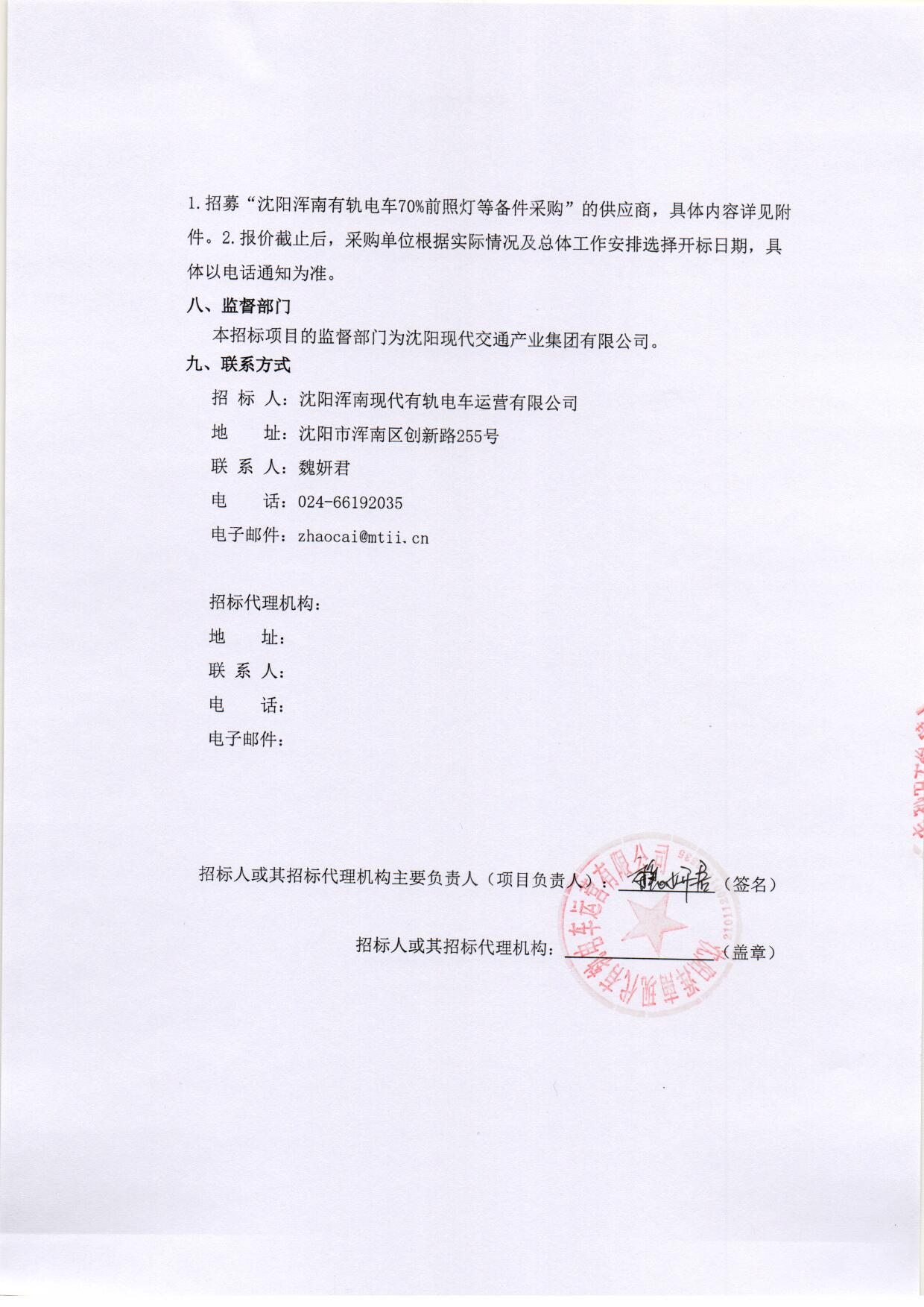 招采公告-招募“沈阳浑南有轨电车70%前照灯等备件采购”的供应商
