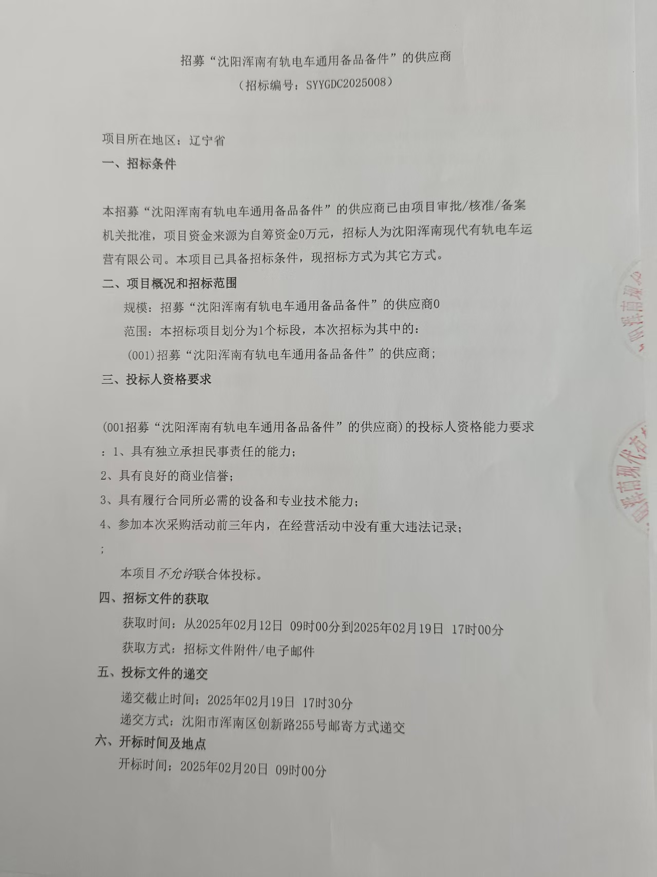 附件-招募“沈阳浑南有轨电车通用备品备件”的供应商
