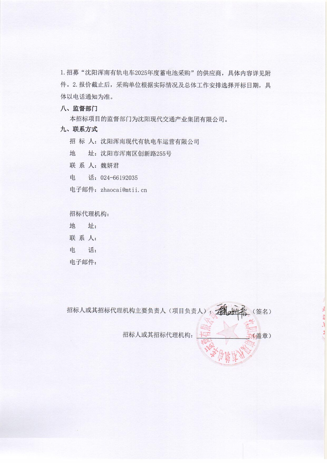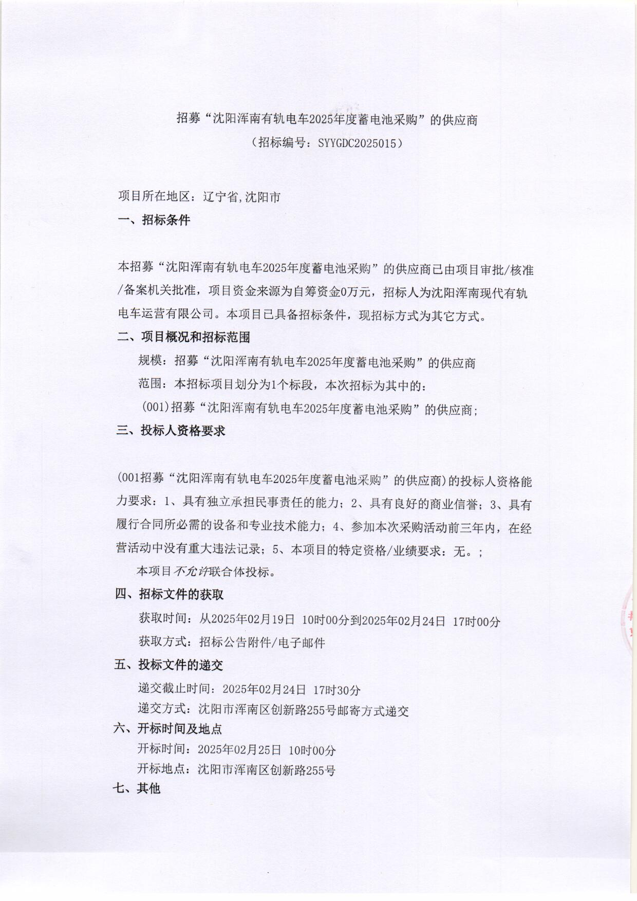 招采公告-招募“沈阳浑南有轨电车2025年度蓄电池采购”的供应商