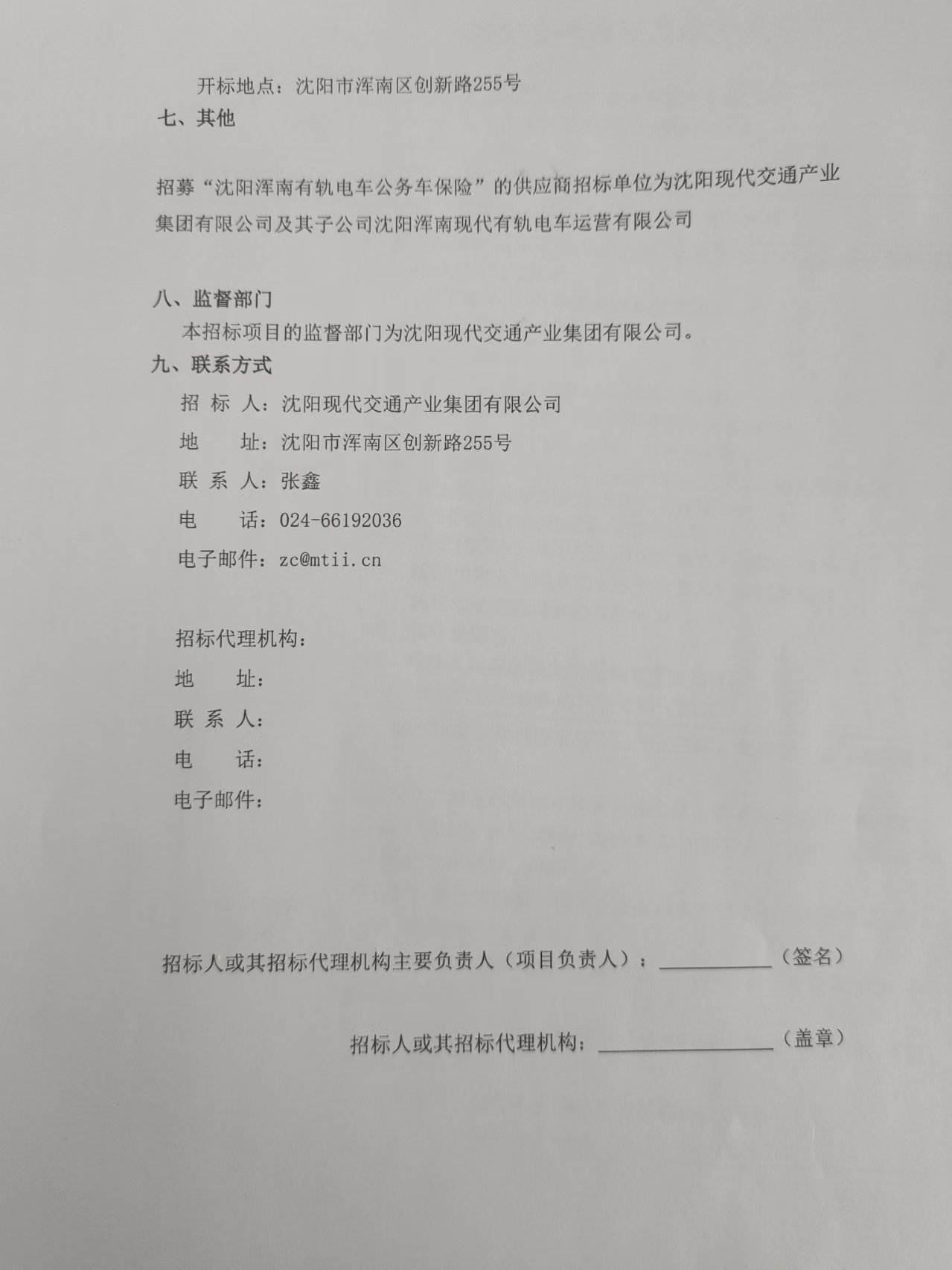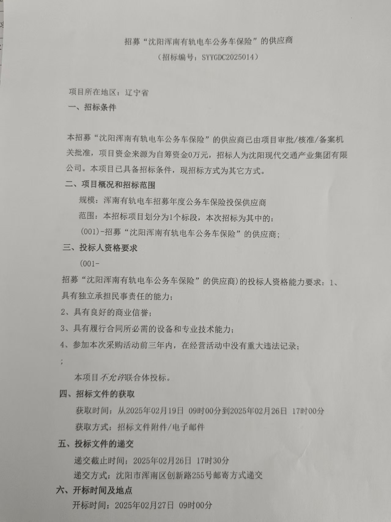 招采公告-招募“沈阳浑南有轨电车公务车保险”的供应商
