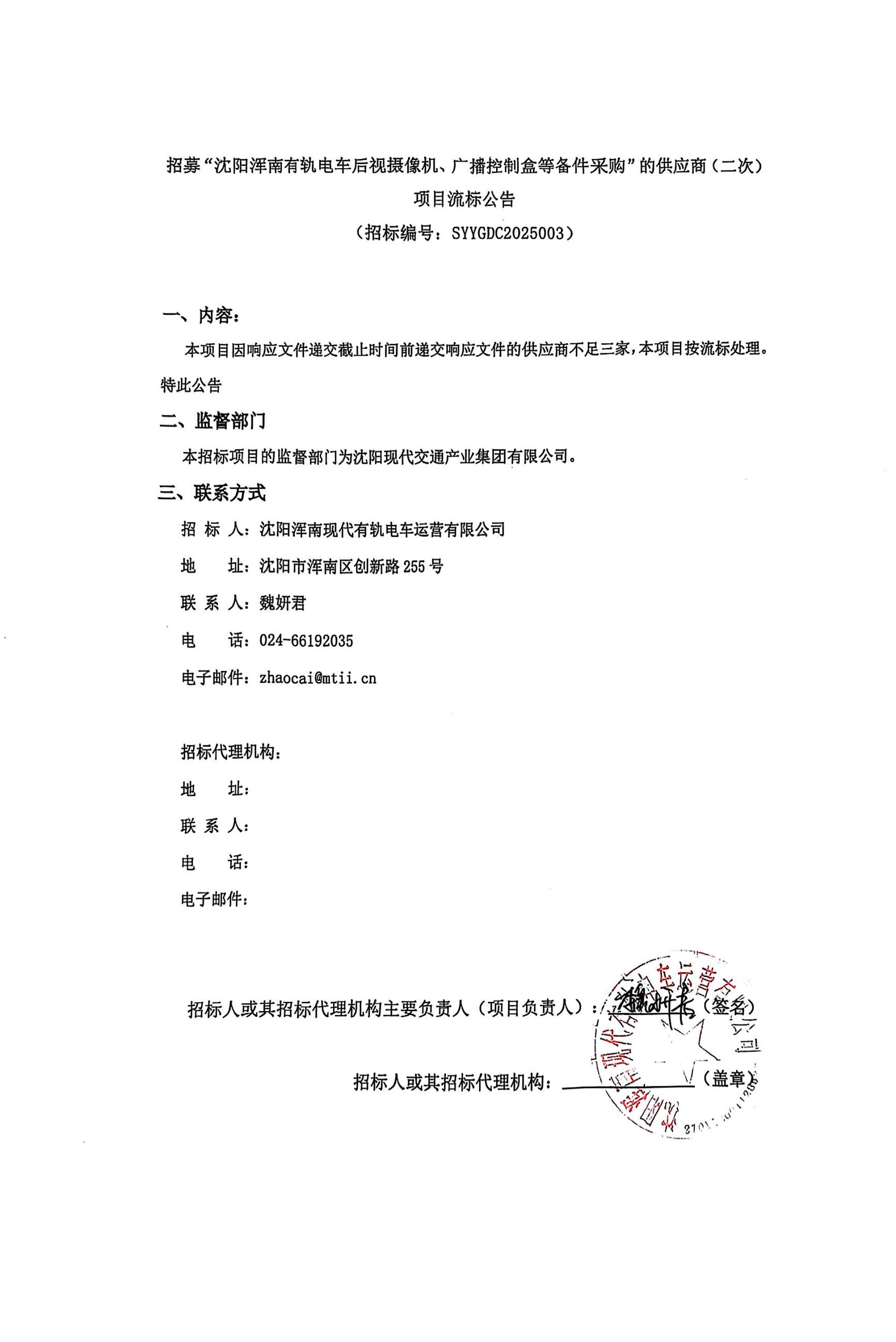 招募“沈阳浑南有轨电车后视摄像机、广播控制盒等备件采购”的供应商(二次)项目流标公告