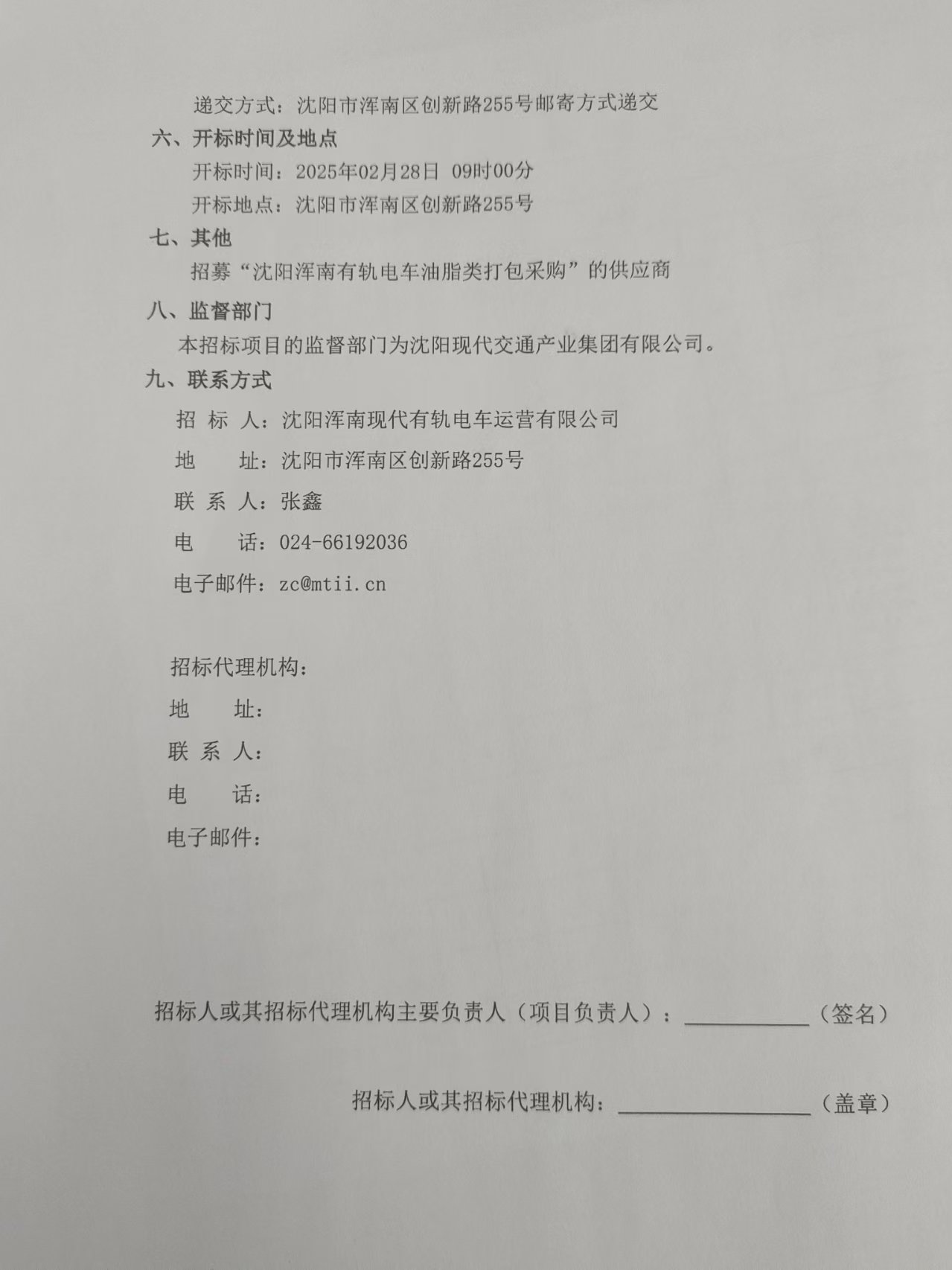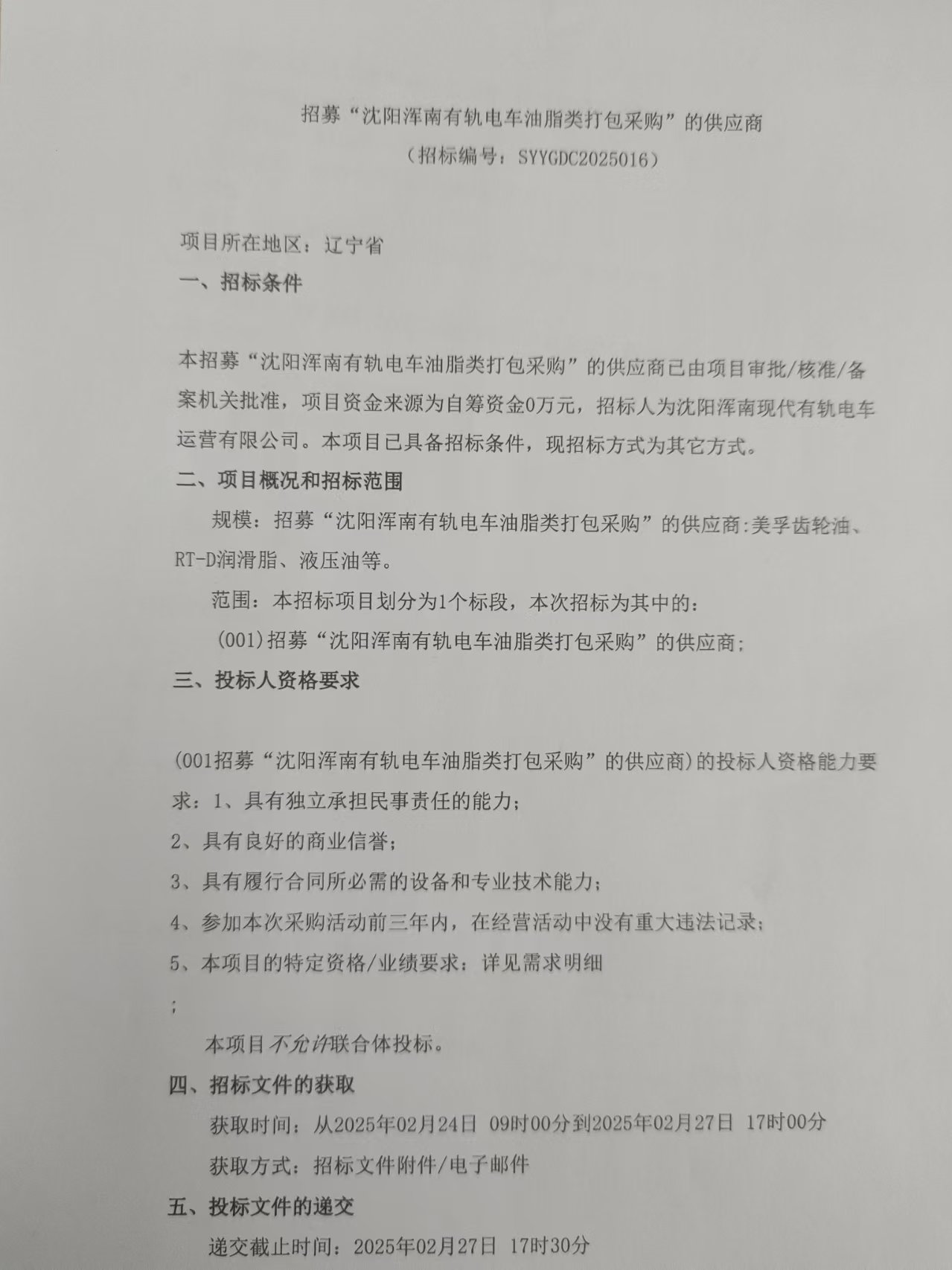 招采公告-招募“沈阳浑南有轨电车油脂类打包采购”的供应商