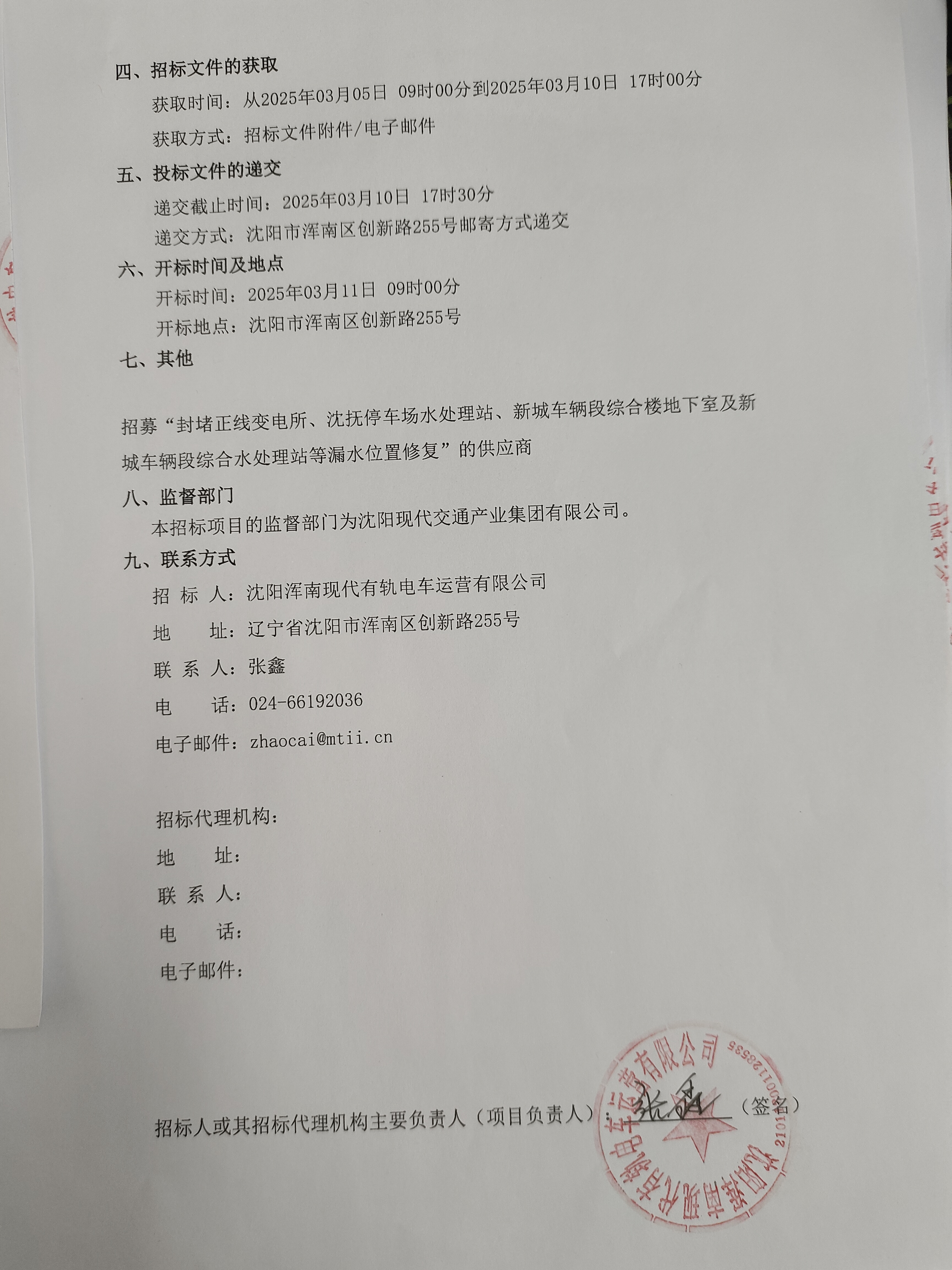 招采公告-招募“封堵正线变电所、沈抚停车场水处理站、新城车辆段综合楼地下室及新城车辆段综合水处理站等漏水位置修复”的供应商