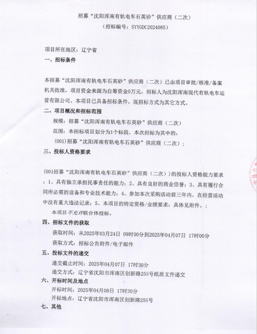 招采公告-招募“沈阳浑南有轨电车石英砂”供应商(二次)