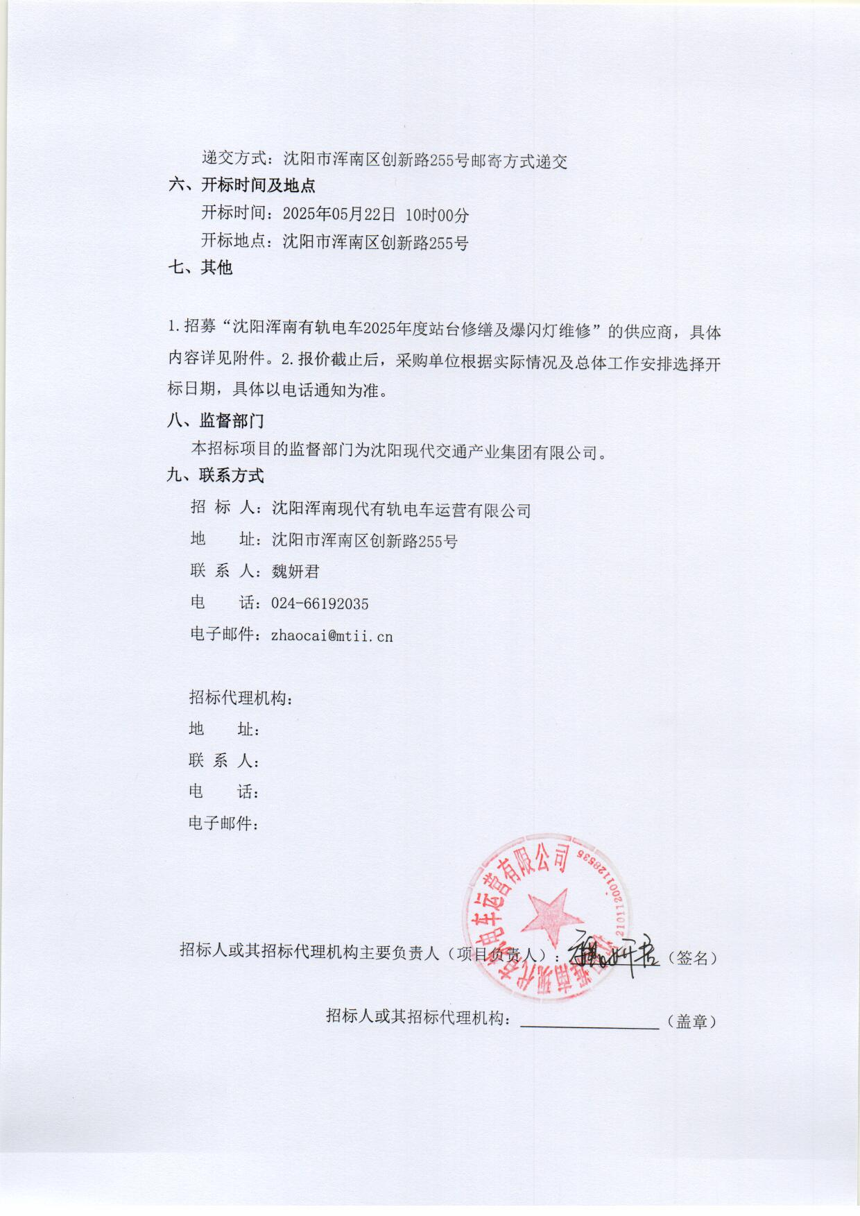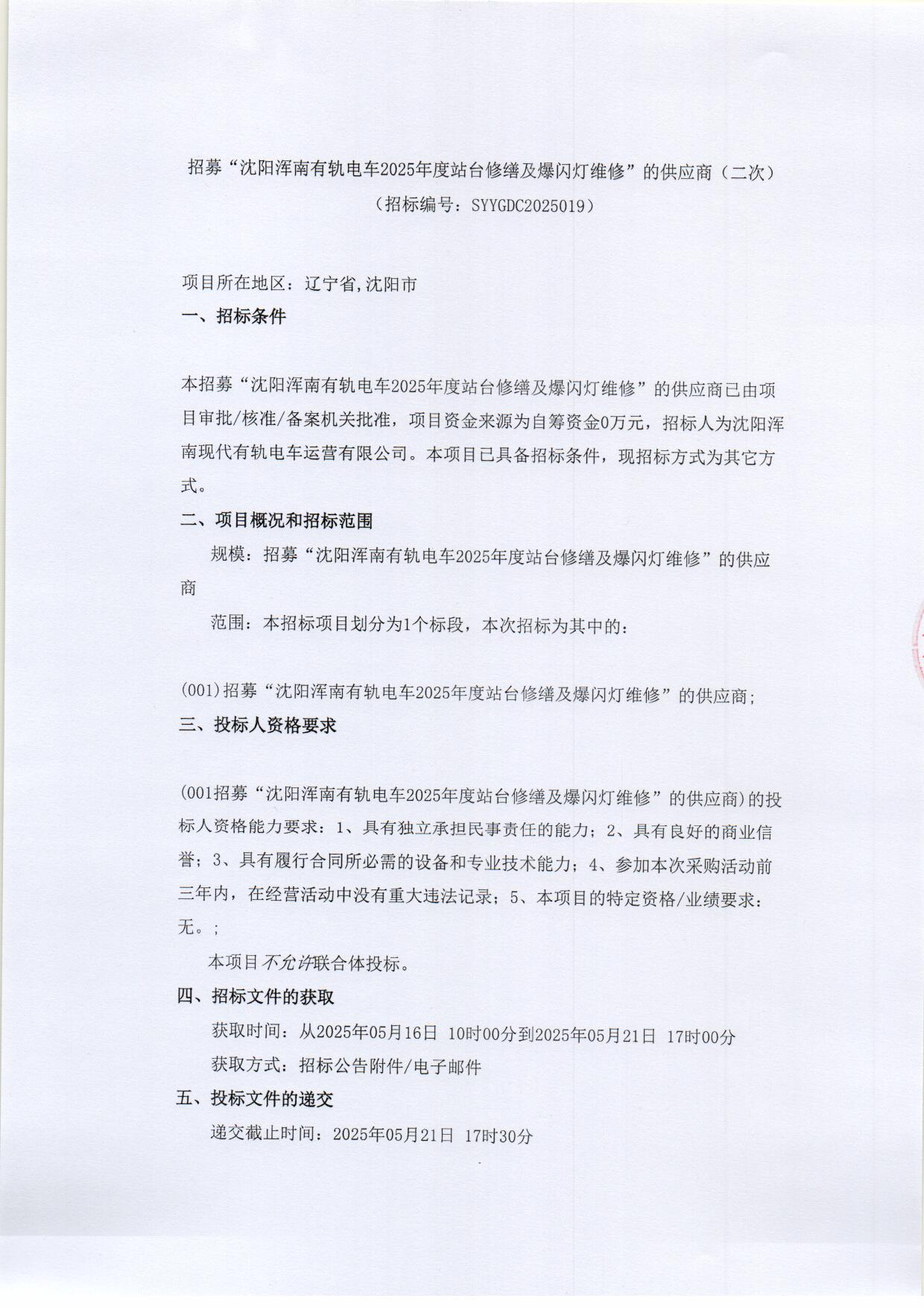 招募“沈阳浑南有轨电车2025年度站台修缮及爆闪灯维修”的供应商(二次)