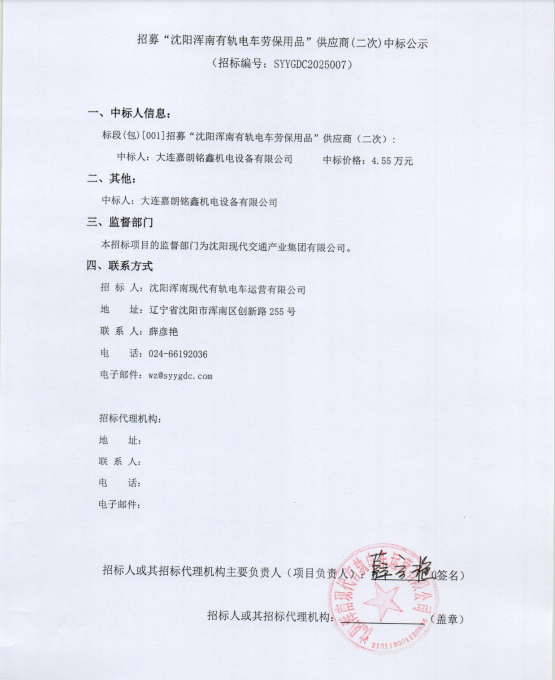 招募“沈阳浑南有轨电车劳保用品”供应商(二次)中标公示
