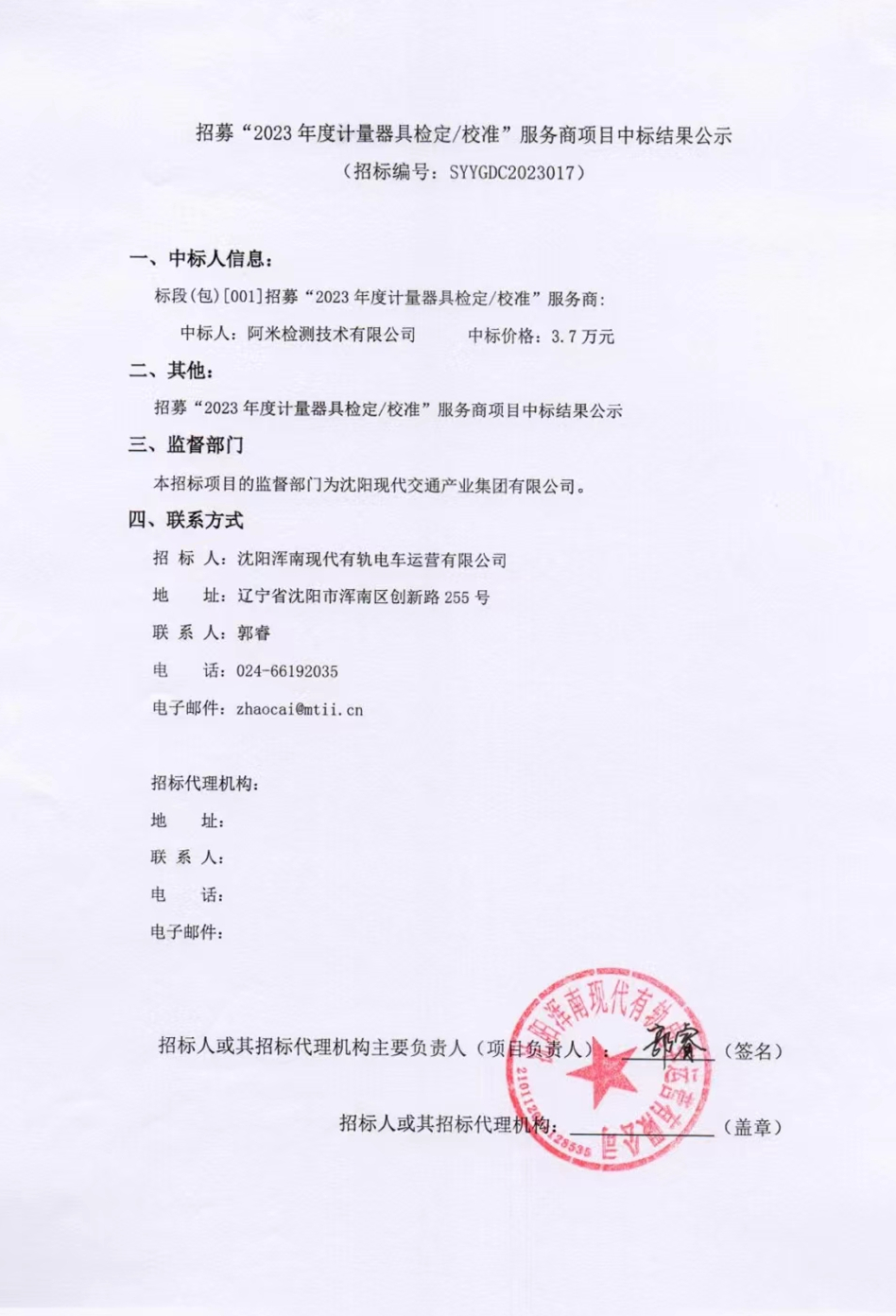 招募“2023年度计量器具检定校准”服务商项目中标结果公示