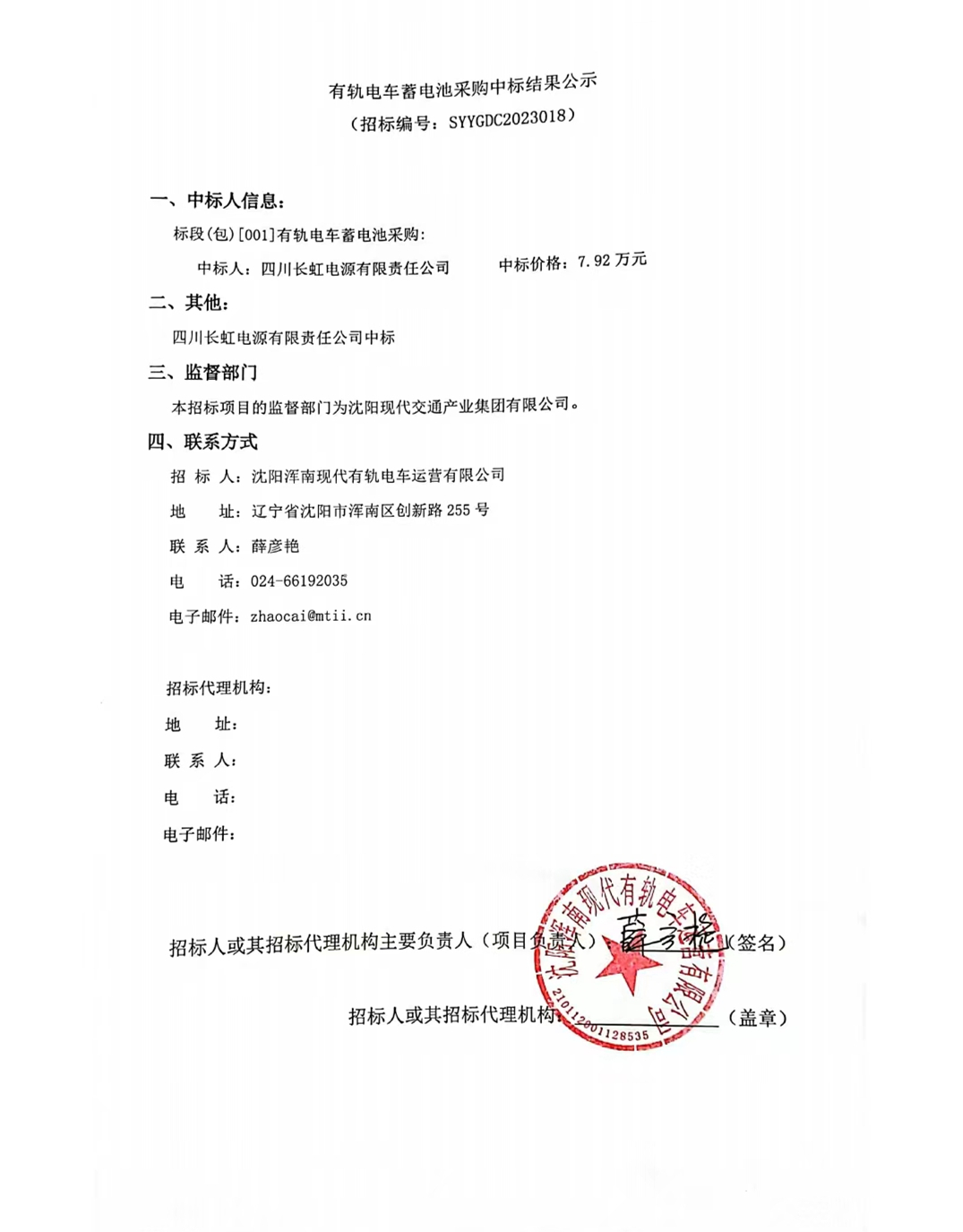 招募“有轨电车蓄电池采购”项目中标结果公示