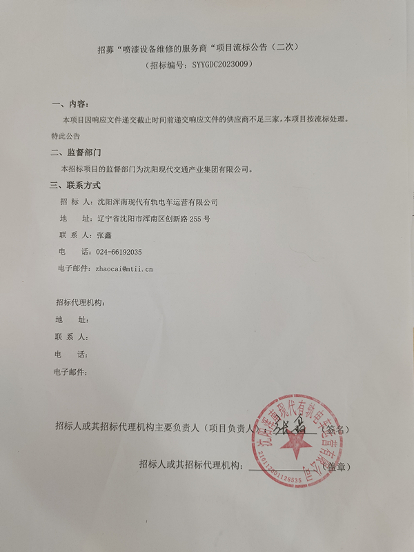 招募“喷漆设备维修的服务商”项目流标公告