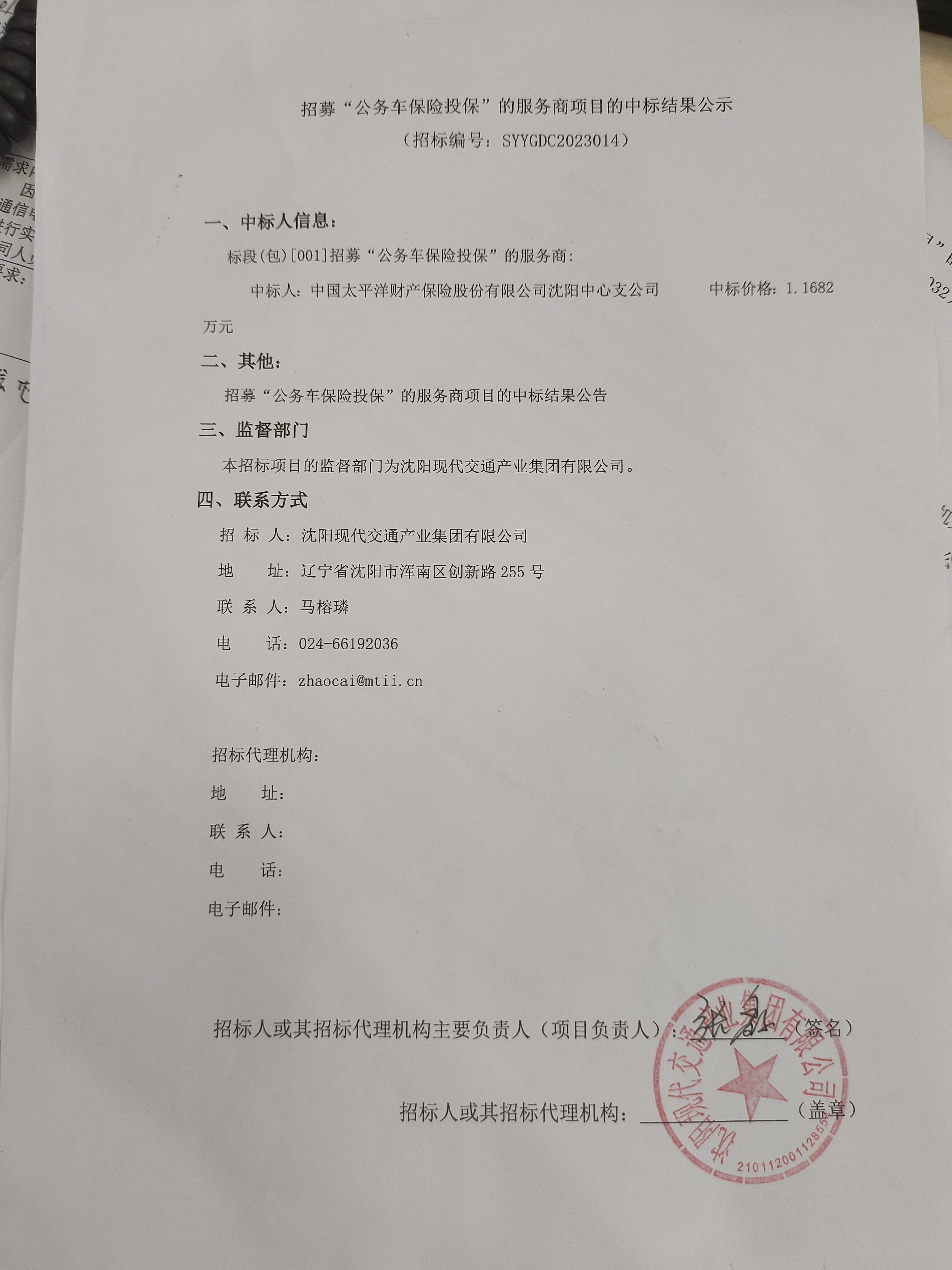 招募“公务车保险投保”的服务商项目的中标结果公示